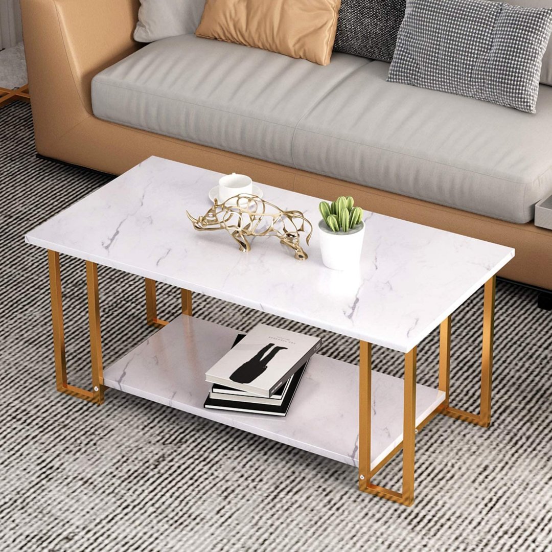 Modern tasarımı ve fonksiyonel yapısıyla dikkat çeken bu orta sehpa, beyaz mermer üst tablası ve altın tonlu metal ayaklarıyla yaşam alanlarına lüks ve zarif bir dokunuş katıyor. Alt kısmında yer alan raf bölmesi, kitap, dergi veya dekoratif objeler için ek kullanım alanı sunarak şıklığı işlevsellikle buluşturuyor.
