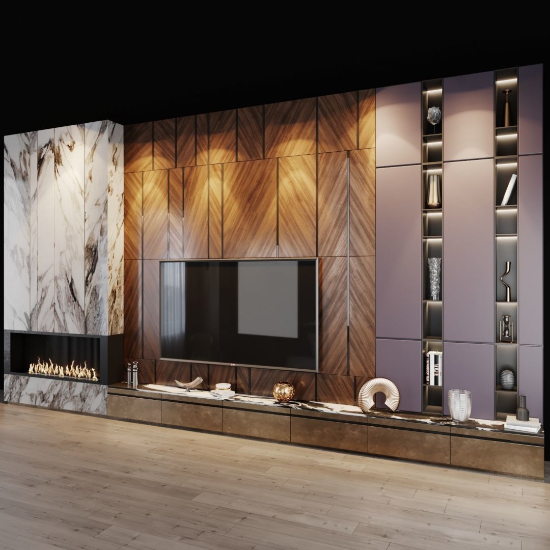 Modern çizgileri ve seçkin malzeme kombinasyonuyla öne çıkan bu şömine/TV ünitesi, yaşam alanlarına sofistike bir karakter katıyor. Mermer detaylı entegre şömine, mekâna sıcaklık ve zarafet kazandırırken; ceviz dokulu ahşap paneller doğal bir şıklık sunuyor. Yan bölümdeki dekoratif nişler ve raf sistemleri, estetik objeleri sergilemek için mükemmel bir alan oluşturuyor. Geniş depolama kapasitesi, modern tasarım dili ve görsel bütünlüğüyle bu ünite, lüks yaşam alanlarının vazgeçilmez parçası olacak.