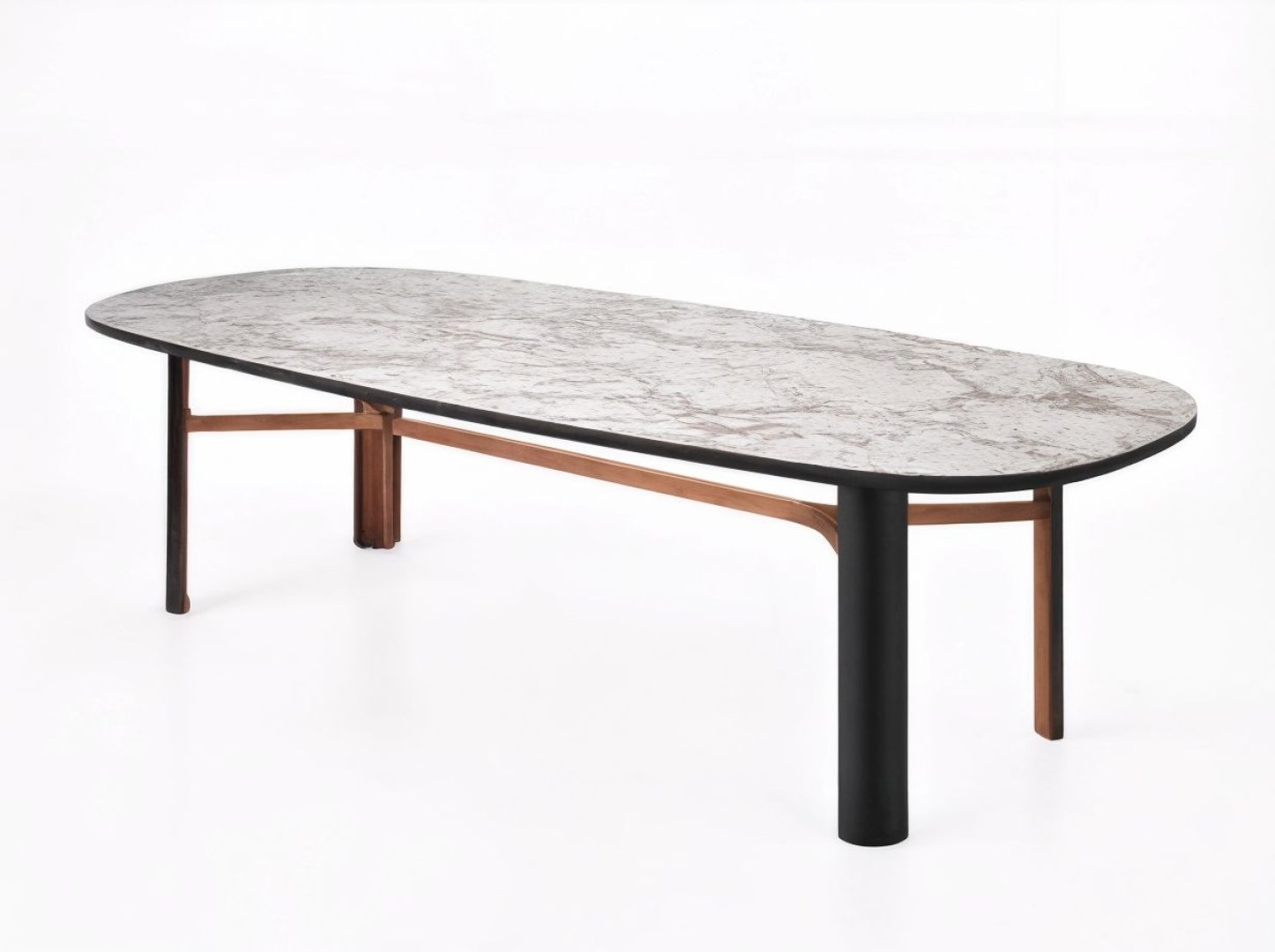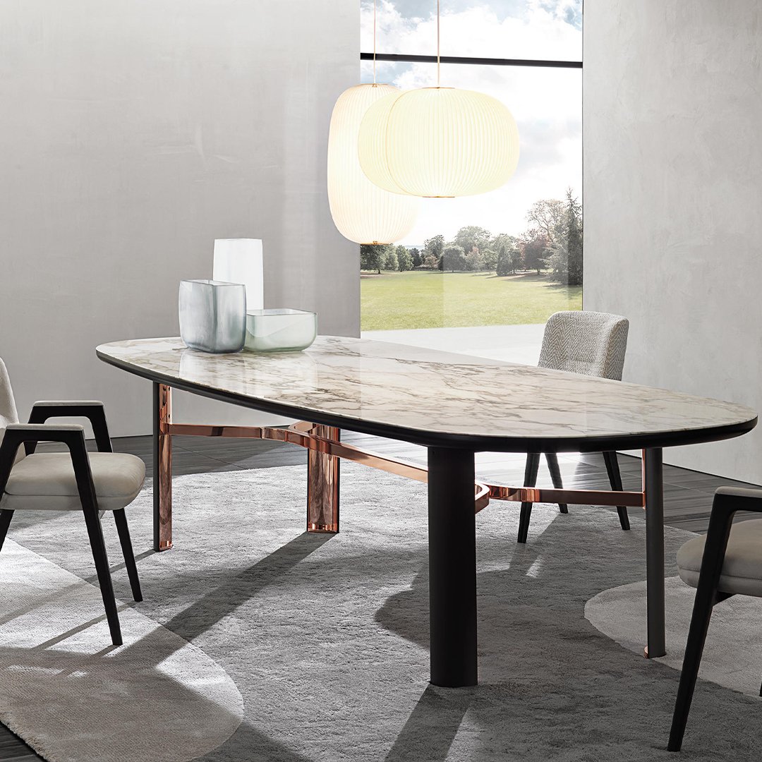 Masayı tamamlayan ayak tasarımı, güçlü ve zarif bir denge sağlar. Modern çizgilerle yorumlanmış metal ayaklar, hem sağlamlık hem de estetik bir bütünlük sunar. Altın kaplama detayları, Calacatta Gold’un doğal ışıltısıyla uyum içinde birleşir.