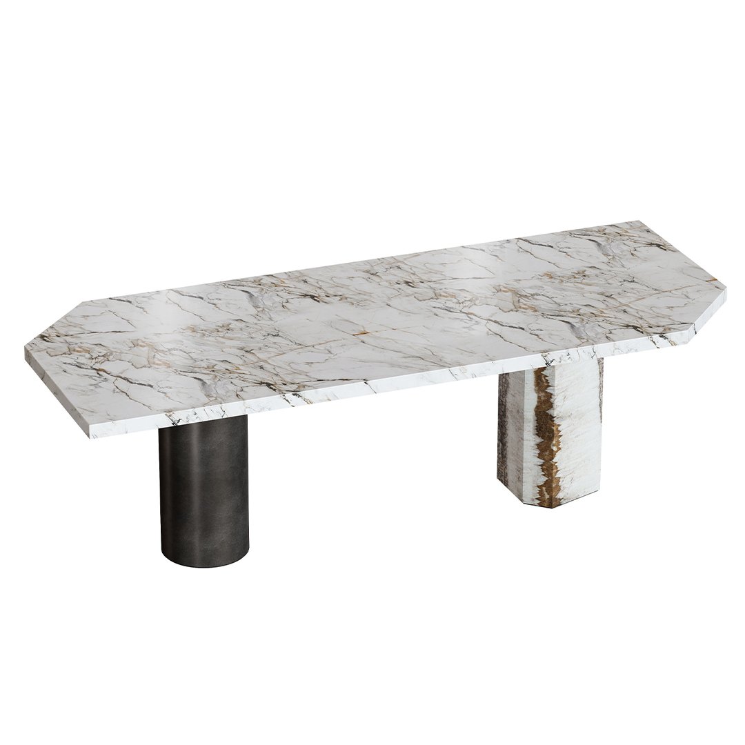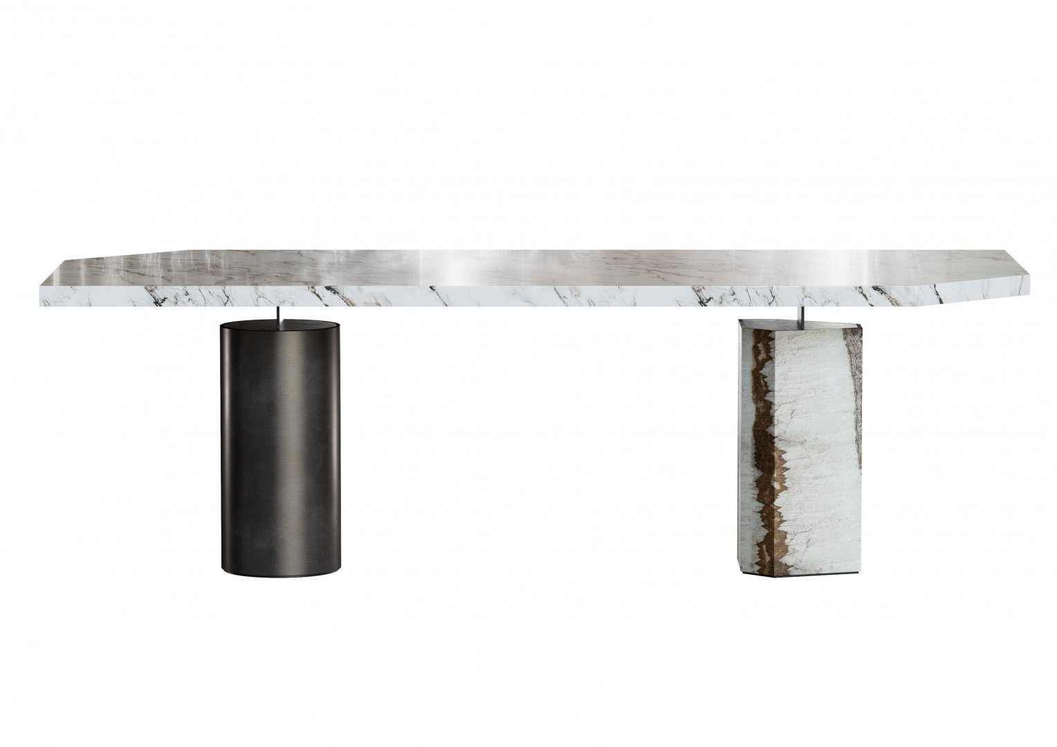 Bu farklı malzeme ve form kombinasyonu, masaya heykelsi bir karakter kazandırarak onu sıradan bir mobilyadan çıkarıp mekânın odak noktası haline getirir.