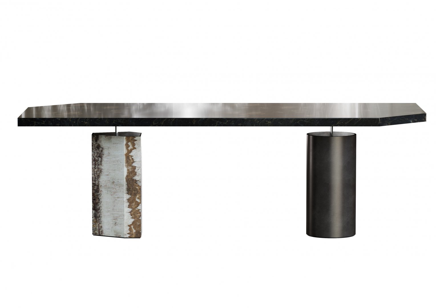Masanın en dikkat çekici özelliği, farklı malzemelerden oluşan çift ayak tasarımıdır. Bir ayağı silindirik, mat siyah metal kaplamalı modern bir form taşırken; diğer ayağı doğal taşın organik dokusunu yansıtan, rustik tonlu ve geometrik şekilli özel bir bloktan oluşur.