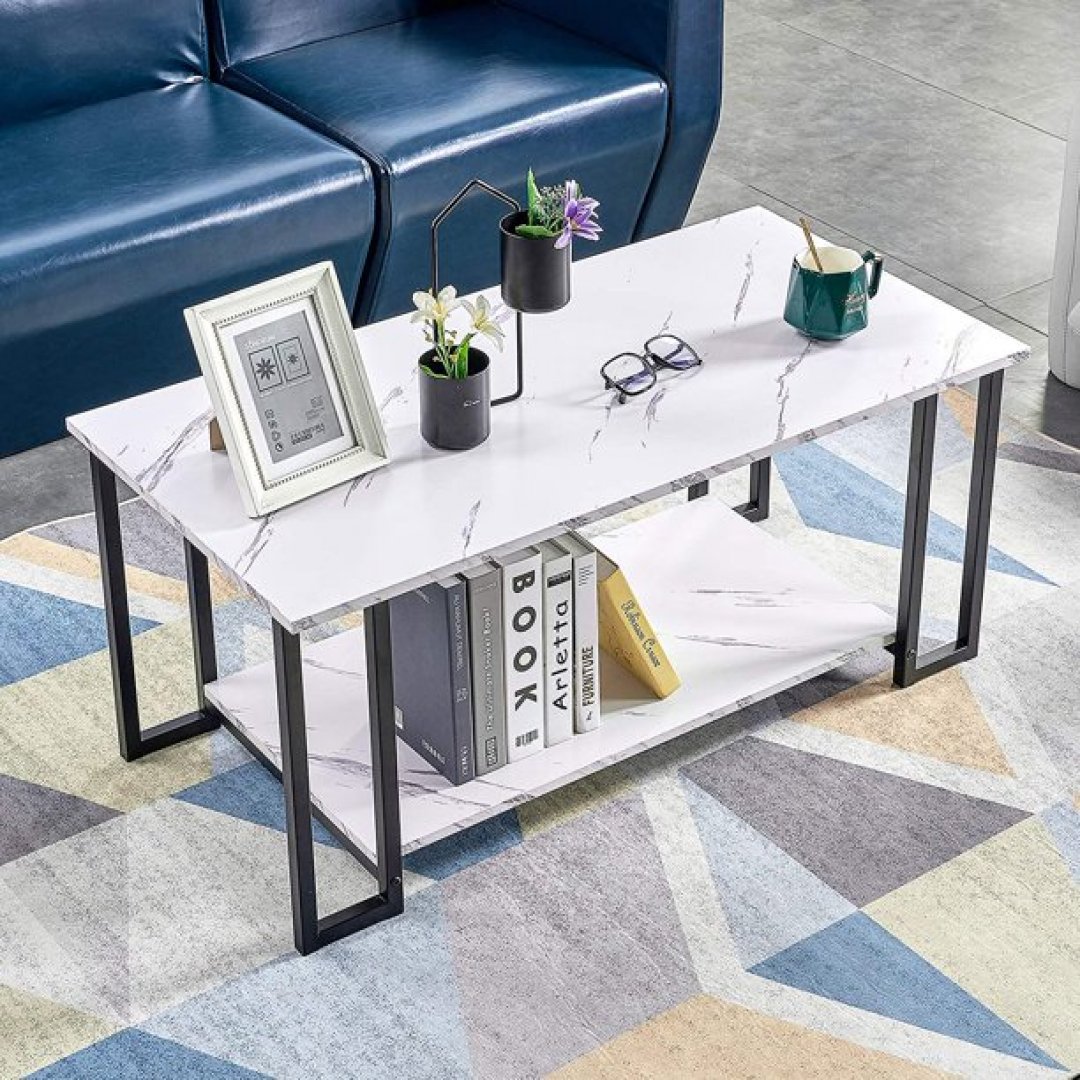 Modern tasarımıyla dikkat çeken bu dikdörtgen orta sehpa, beyaz mermer üst tablası ve siyah metal ayaklarıyla yaşam alanlarına şık bir karakter kazandırıyor. Alt kısmında yer alan raf, kitaplar, dergiler veya dekoratif objeler için ek alan sunarak hem estetik hem de işlevsellik sağlıyor.