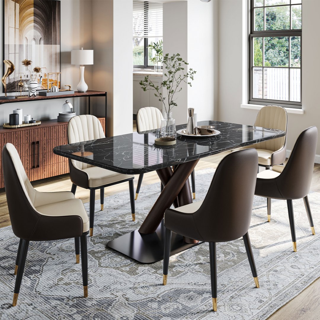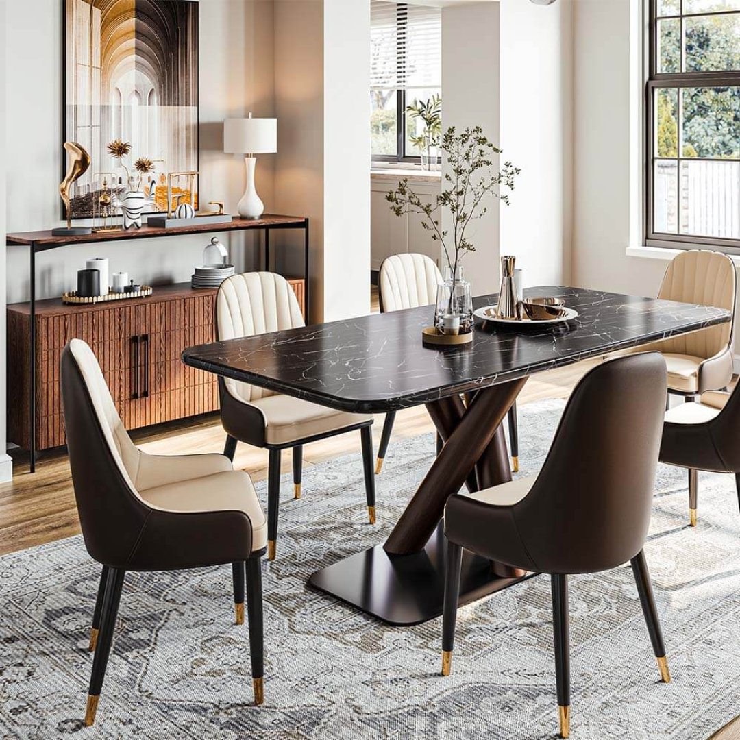 Modern tasarımın zarafetle buluştuğu Çapraz Ayaklı Nero Marquina Mermer Masa, yemek alanınıza şıklık ve prestij katıyor.