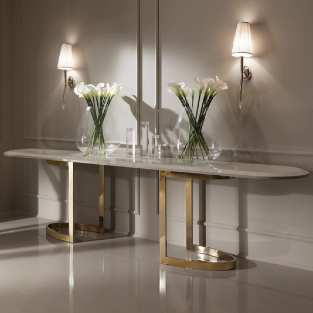 Zarif çizgileri, göz alıcı mermer yüzeyi ve altın tonlardaki modern ayak tasarımıyla bu lüks mermer dresuar, yaşam alanlarına sofistike bir şıklık katıyor. Oval hatlı ince mermer tabla, zarafetle buluşurken; geometrik altın metal ayak yapısı mekâna modern sanat dokunuşu kazandırıyor. Şıklığı ve işlevselliği bir araya getiren bu tasarım, lüks mekanların odak noktası olmaya aday.
