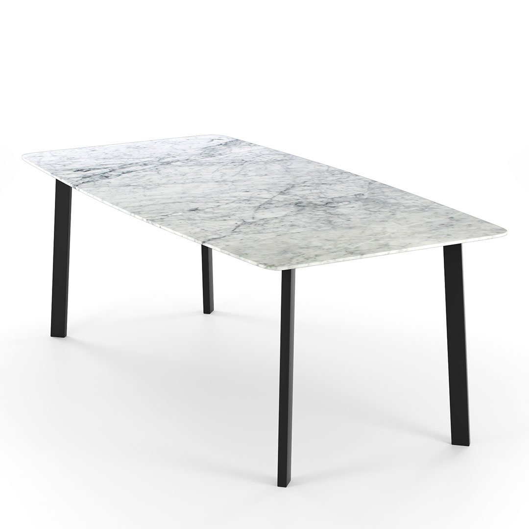Üst yüzeyinde kullanılan beyaz doğal mermer, gri damar detaylarıyla mekâna ferah, sofistike ve zamansız bir görünüm kazandırır. Masanın siyah metal ayakları, güçlü yapısıyla sağlamlık ve denge sağlarken modern mimariyi yansıtan minimal çizgileriyle tasarıma zarif bir kontrast katar. İnce fakat dayanıklı yapısı, masaya hafiflik hissi verirken uzun ömürlü kullanım garantisi sunar.