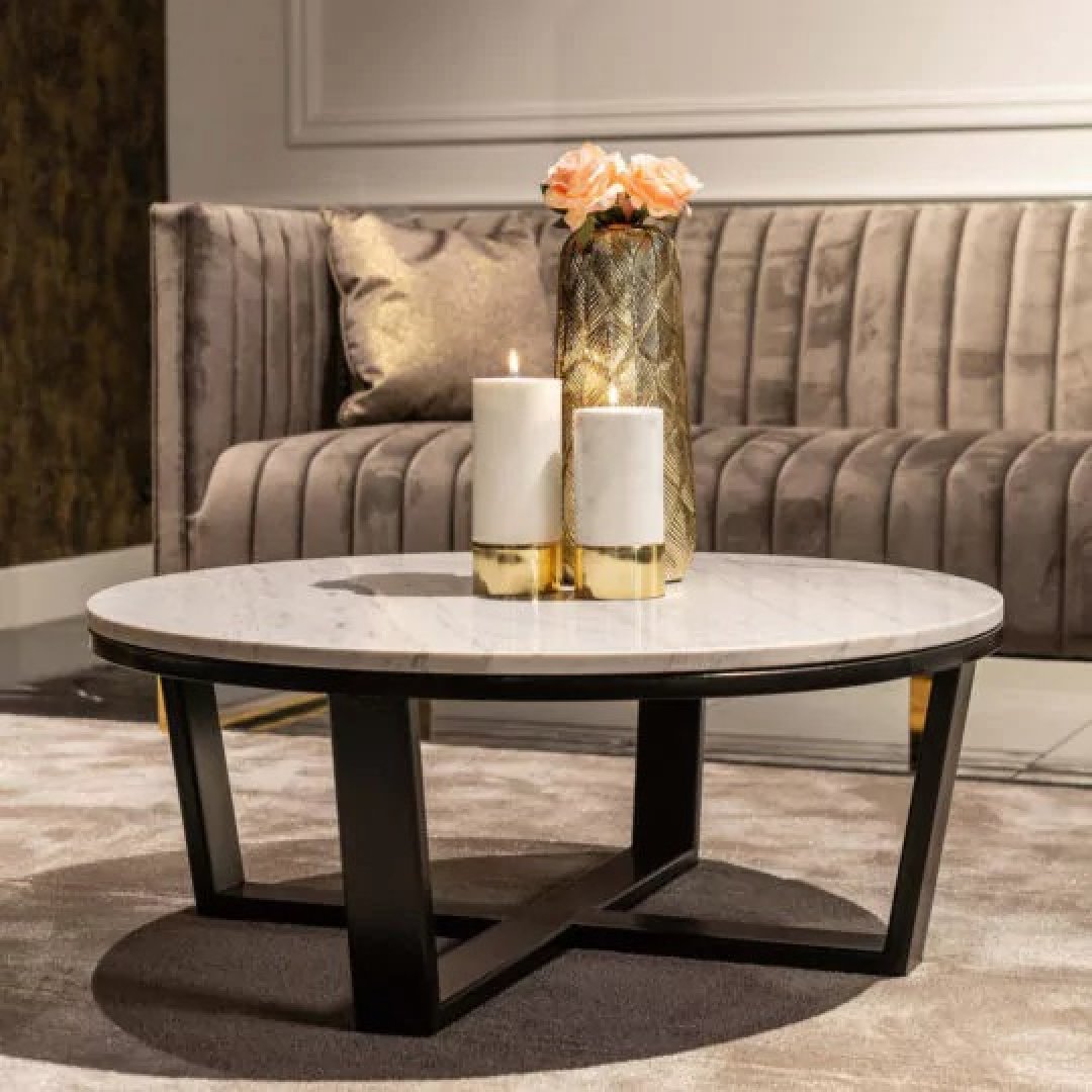 Zarif detayları ve modern tasarımıyla öne çıkan bu yuvarlak mermer orta sehpa, beyaz mermer yüzeyi ve siyah metal ayaklarıyla sofistike bir görünüm sunuyor. Geometrik ayak yapısı, hem sağlamlığı artırıyor hem de mekâna modern bir karakter katıyor.