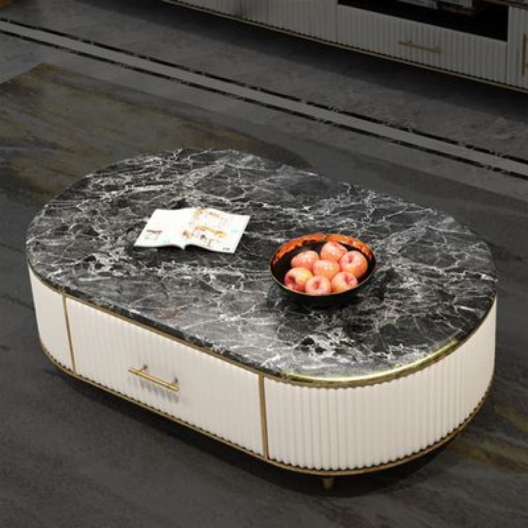Lüks detayları ve modern tasarımıyla öne çıkan bu oval orta sehpa, siyah mermer üst tablası ve alt kısmında yer alan fonksiyonel çekmeceleriyle hem estetik hem de pratik bir kullanım sunuyor. Altın rengi ince detaylarla zenginleştirilen beyaz gövdesi, mekâna sofistike bir hava katıyor.