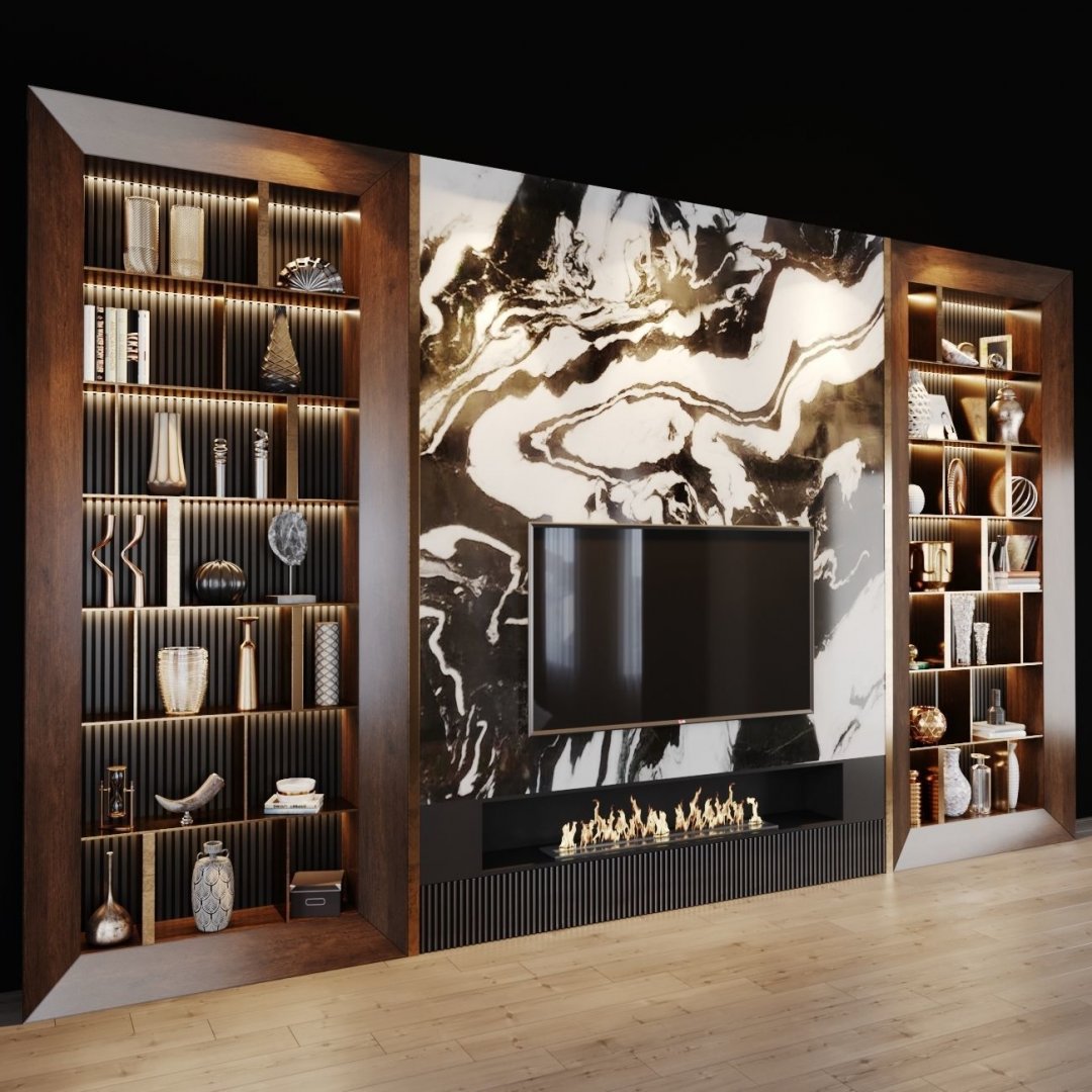 Doğal mermerin göz alıcı desenleri ve ahşabın sıcak dokusunu bir araya getiren bu şömine-TV ünitesi, modern yaşam alanlarına zarafet ve lüks katan bir başyapıt. Siyah, beyaz ve altın tonlarının dramatik geçişler yarattığı mermer şömine paneli; yanlardaki LED aydınlatmalı geniş raf sistemleriyle bütünleşerek estetik ve işlevselliği bir arada sunuyor. Entegre şömine ise hem sıcak bir atmosfer oluşturuyor hem de mekânın merkezinde prestijli bir odak noktası yaratıyor.