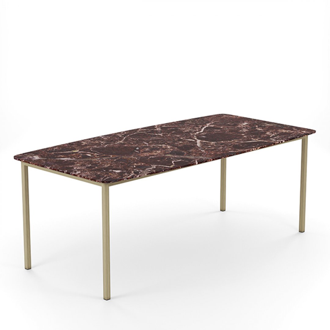 Sade ve şık tasarım anlayışının en zarif örneklerinden biri olan bu masa, bordo mermerin derin ve zengin tonlarını minimal metal ayak tasarımıyla buluşturuyor.