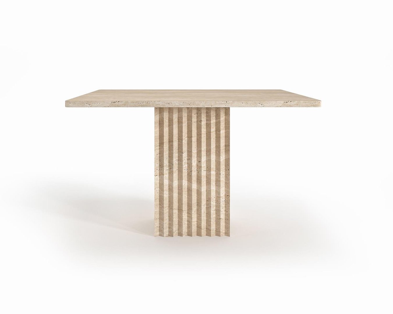 Üst yüzeyde kullanılan açık bej traverten, yatay damar akışı ile sıcak, dengeli ve şık bir görünüm sağlar. Dikey kanallı kare blok ayak, hem sağlam bir taşıyıcı yapı hem de mimari bir estetik sunar.