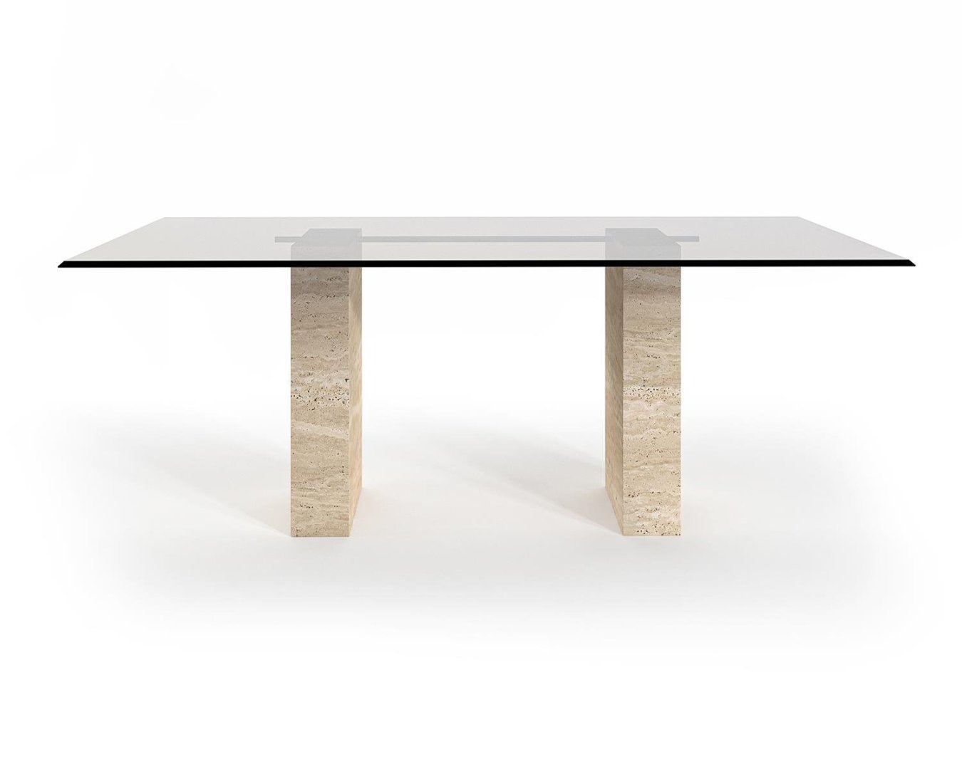 Üst yüzeyde kullanılan şeffaf temperli cam, mekâna ferahlık ve ışık geçirgenliği kazandırır. Alt yapıda yer alan iki adet dikdörtgen traverten panel ayak, hem güçlü bir taşıyıcı hem de doğal bir estetik unsur olarak öne çıkar.