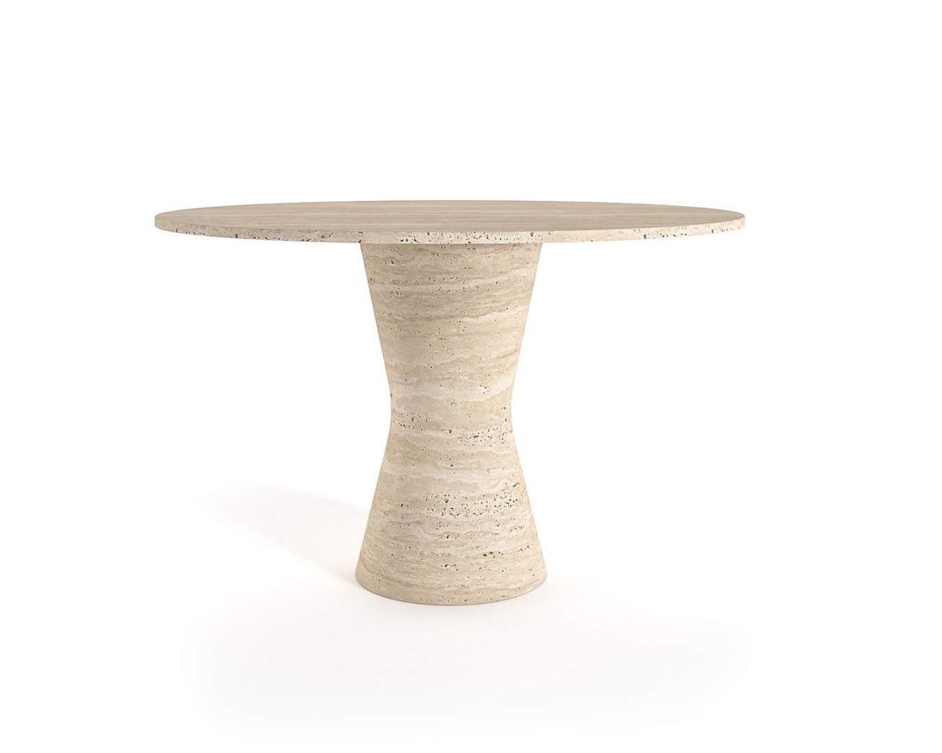 Üst yüzeyinde kullanılan açık bej traverten, yatay damar akışı ile sıcak ve sofistike bir atmosfer yaratır. Ortadan daralan konik ayak formu, masaya zarif bir siluet ve güçlü bir taşıyıcı yapı kazandırır.
