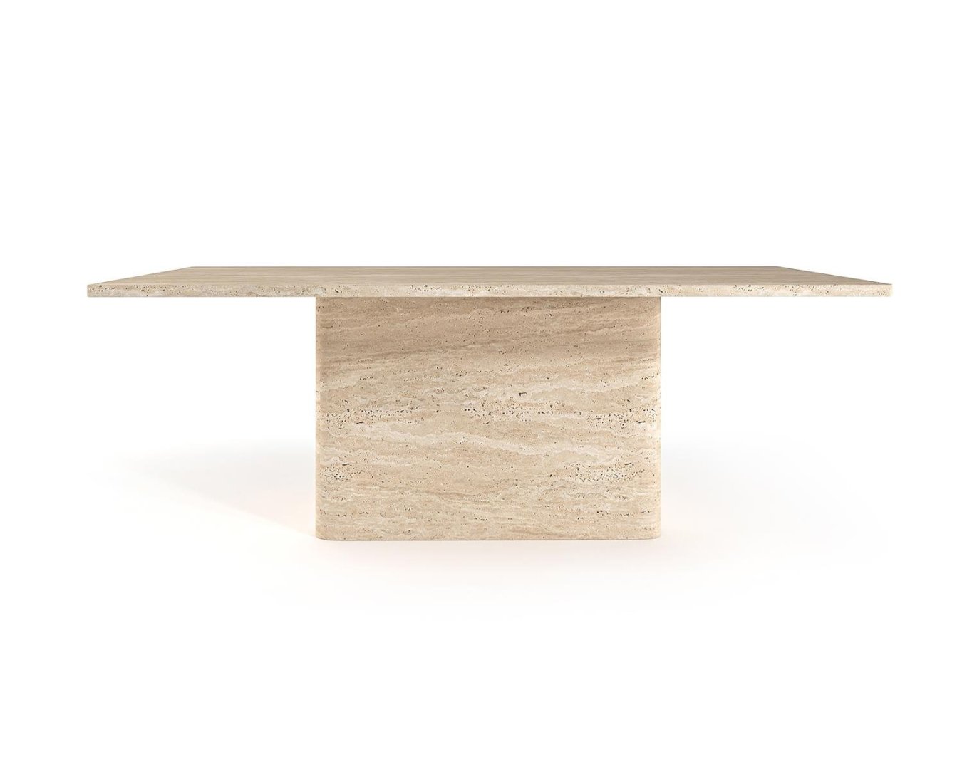 Üst yüzeyinde kullanılan açık bej traverten, yatay damar akışı ile mekâna sıcak ve dengeli bir estetik kazandırır. Tek parça geniş blok ayak, masaya sağlamlık ve mimari bir bütünlük katar.