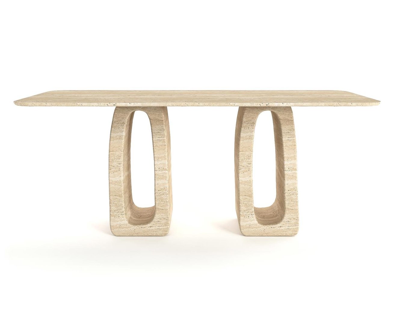 Doğal taşın zamansız güzelliğini dikkat çekici bir ayak tasarımıyla buluşturan bu dikdörtgen traverten masa, modern mekânların merkezinde yer almak için tasarlandı.