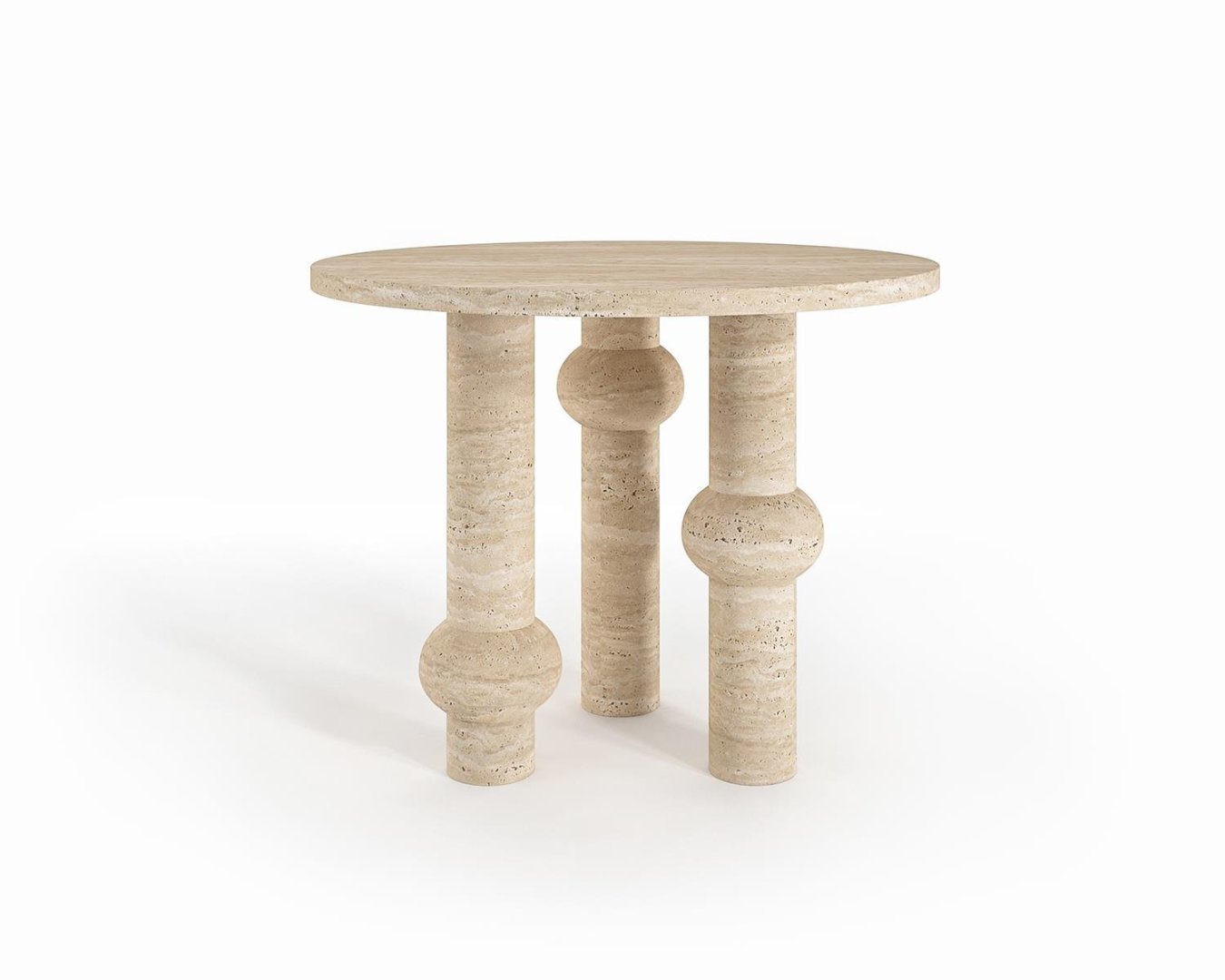 Üst yüzeyde kullanılan açık bej traverten, yatay damar akışı ile mekâna sıcaklık ve sofistike bir görünüm katar. Küre detaylı silindirik ayaklar, masaya dinamik bir siluet ve sanatsal bir kimlik kazandırır.