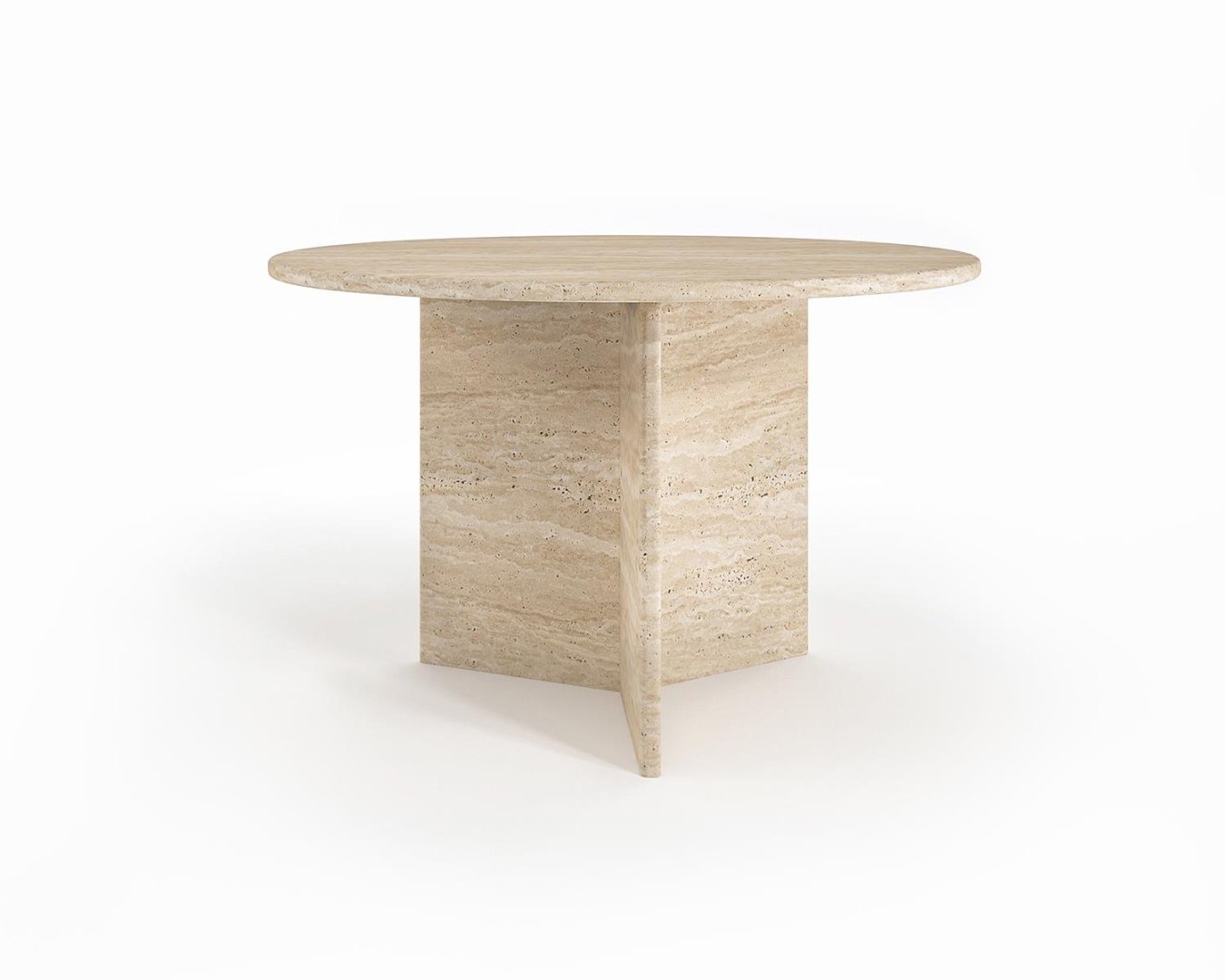 Doğanın sunduğu açık bej travertenin sıcak tonlarını modern bir formda sunan bu yuvarlak masa, hem konforlu oturum alanı hem de denge odaklı tasarımı ile öne çıkar.
