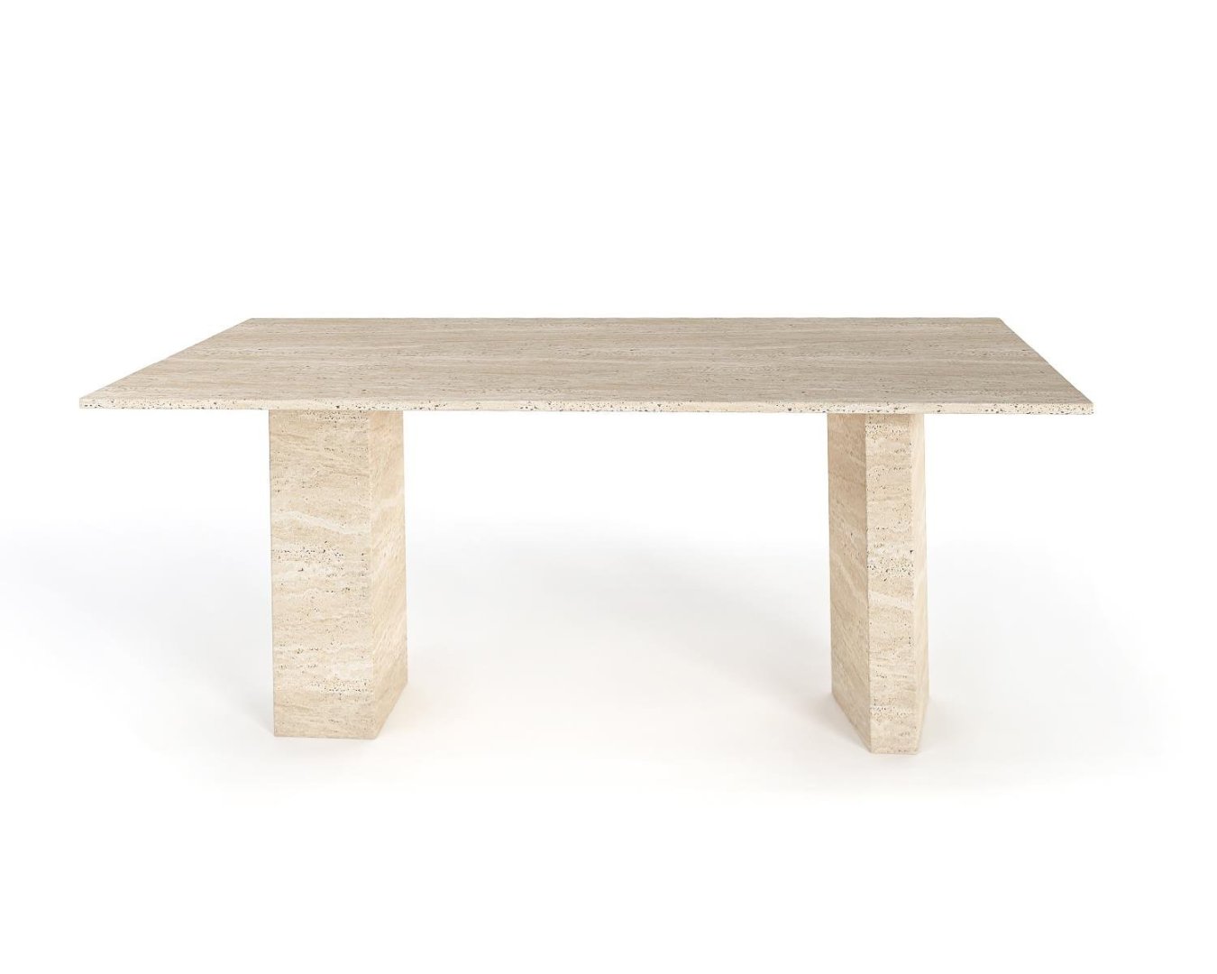 Dik panel ayak yapısı, masaya hem minimal hem de güçlü bir karakter kazandırırken, cilalı yüzey travertenin eşsiz damar desenlerini gözler önüne seriyor. Dayanıklılığı sayesinde hem iç hem dış mekânlarda uzun yıllar kullanılabilir.