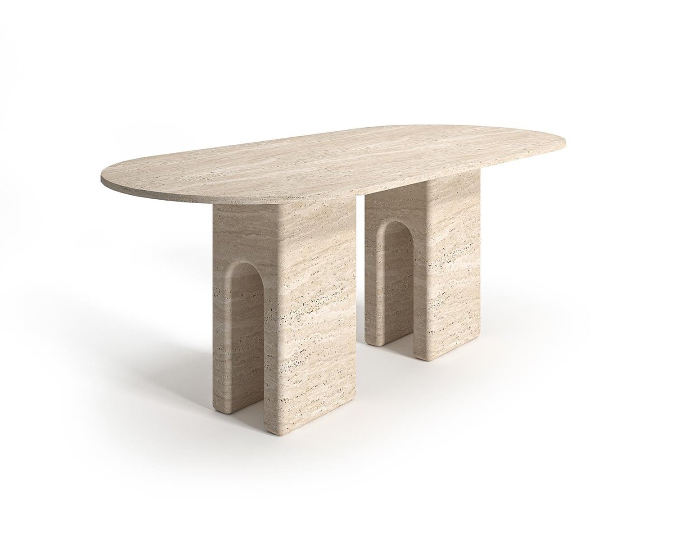 Doğal bej traverten taşın zarafeti, modern tasarım anlayışıyla buluşuyor. Oval masa tablası, mekâna yumuşak bir akış katarken, kemer detaylı masif ayaklar güçlü ve ikonik bir duruş sergiliyor. Bu tasarım, mimari öğeleri yaşam alanına taşıyan özel bir sanat eseri gibi…