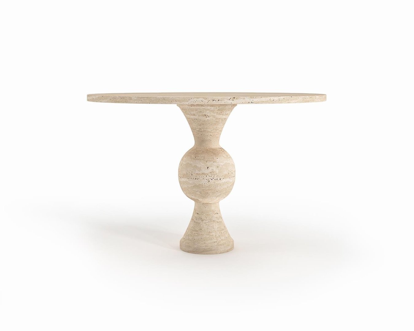 Doğal traverten taşının zamansız güzelliği, heykelsi bir tasarımla buluşuyor. Küre formundaki merkez gövde, yukarı ve aşağı doğru zarifçe incelen siluetle dengeleniyor. Bu tasarım, sadece bir masa değil; mekâna değer katan bir sanat eseri.