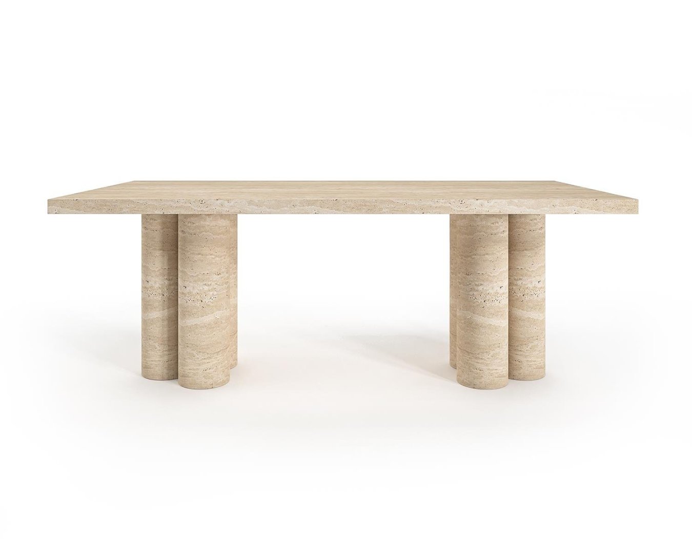 Dörtlü Silindir Ayaklı Dikdörtgen Traverten Masa, doğal traverten taşın sıcak ve zarif tonlarını modern bir tasarım diliyle buluşturuyor. Bej tonlarındaki yüzey, taşın doğal damar yapısıyla her bir masayı benzersiz kılarken, dört adet silindir formundaki ayak, sağlamlık ve estetik dengesi açısından dikkat çekiyor. Geniş dikdörtgen yüzeyi, aile yemeklerinden özel davetlere kadar her ortamda rahat bir kullanım sağlıyor. Dayanıklı yapısı ve kolay temizlenebilir yüzeyi sayesinde uzun ömürlü bir çözüm sunar. Hem modern hem klasik dekorasyonlara uyum sağlayan bu masa, yaşam alanlarında güçlü bir odak noktası oluşturur.