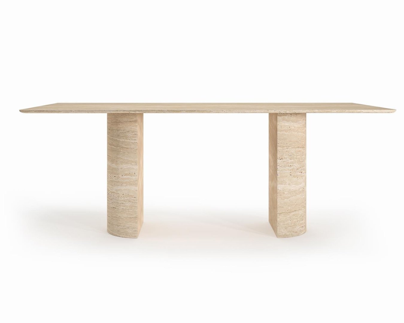 İkili Yarım Silindir Ayaklı Dikdörtgen Traverten Masa, sade tasarımı ve güçlü duruşuyla yaşam alanlarına modern bir şıklık kazandırır. Doğal traverten taşın zarif dokusu, bej tonlarındaki sıcak görünümüyle buluşarak mekâna sofistike bir atmosfer katar. İki adet yarım silindir formundaki ayak, hem estetik hem de sağlamlık açısından öne çıkar. Geniş dikdörtgen yüzeyi, kalabalık sofralar ve uzun davetler için ideal bir alan sunar. Doğal taşın dayanıklılığı sayesinde uzun yıllar ilk günkü formunu korurken, kolay temizlenebilir yüzeyiyle de pratik bir kullanım sağlar. Modern ve klasik dekorasyon stillerine uyum sağlayarak her ortamda zarif bir odak noktası oluşturur.