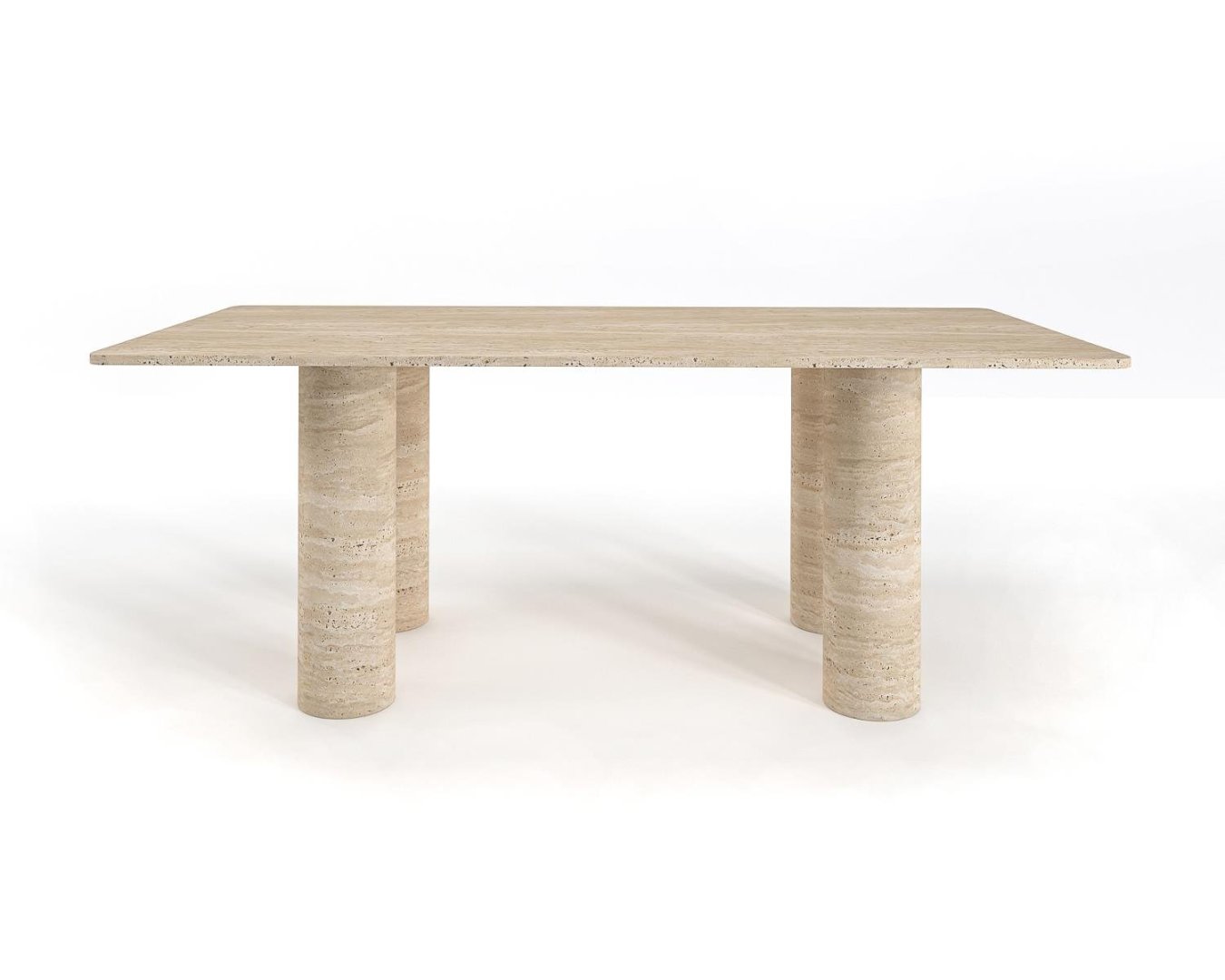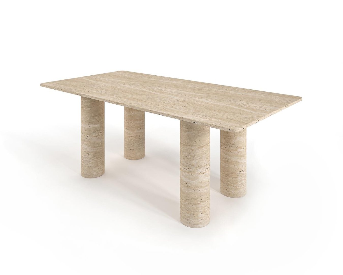 Üst yüzeyinde kullanılan açık bej traverten, yatay damar akışı ile mekâna doğal bir sıcaklık ve dengeli bir görünüm katar. Dört adet tam silindir ayak, masaya güçlü bir taşıyıcı sistem ve simetrik bir duruş kazandırır.