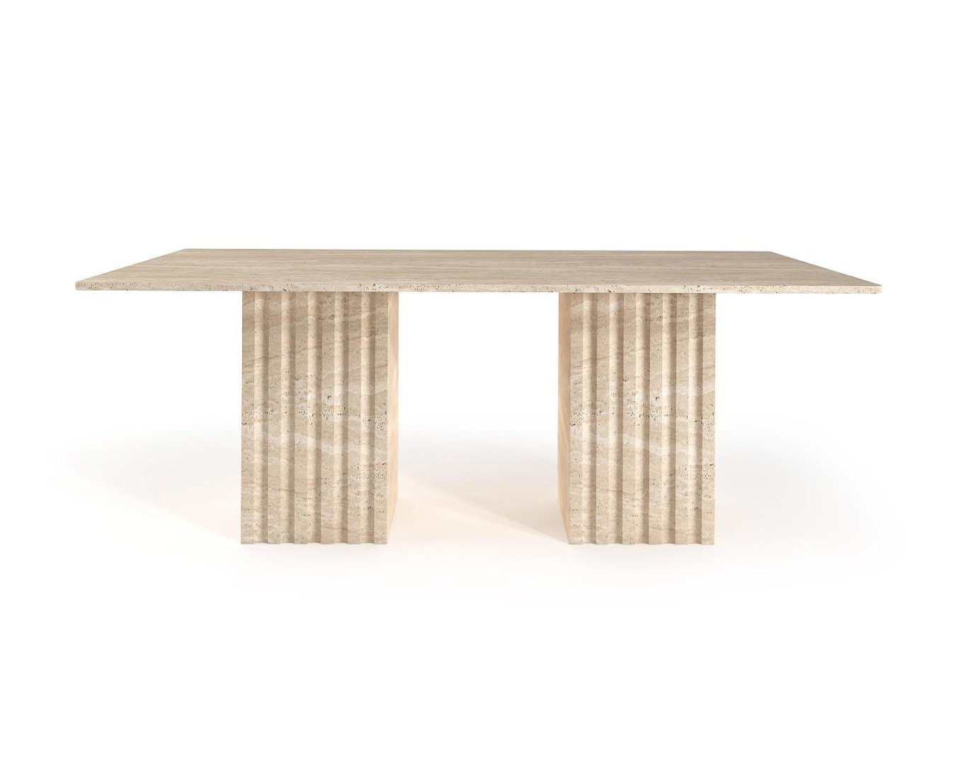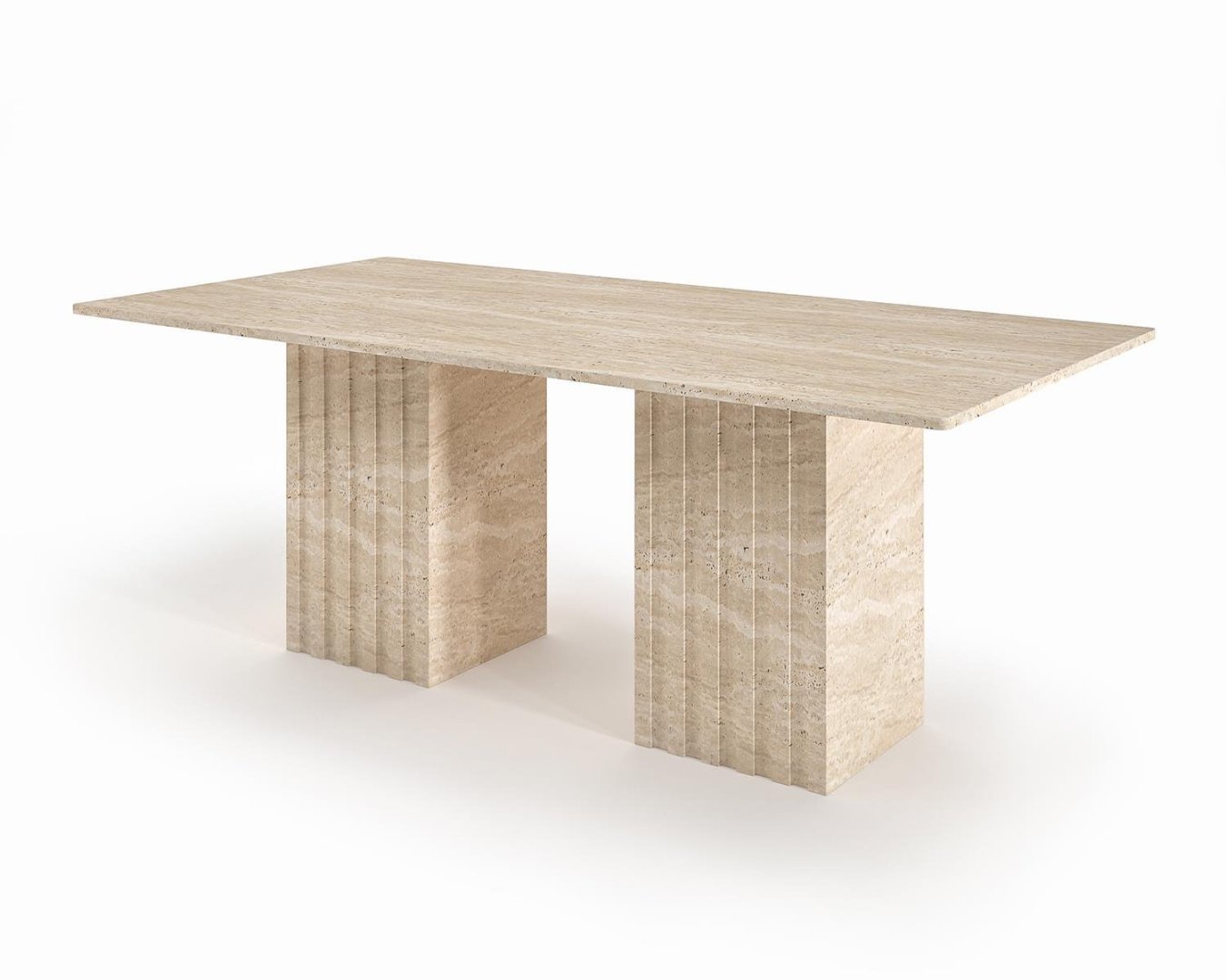 Üst yüzeyinde kullanılan açık bej traverten, yatay damar akışı ile mekâna dengeli ve sıcak bir görünüm kazandırır. İki adet dikdörtgen blok ayak, dikey kanal detayları sayesinde güçlü bir taşıyıcı form sunarken, tasarıma sofistike bir hareket katar.
