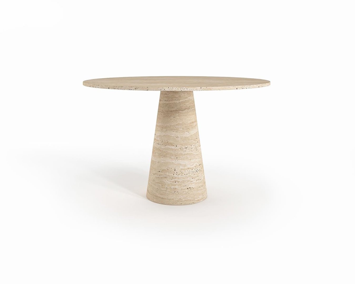 Üst yüzeyinde kullanılan açık bej traverten, yatay damar akışı ile mekâna doğal bir zarafet katar. Tek parça konik ayak, masaya heykelsi bir duruş kazandırırken, oturum alanında ferahlık sağlar.
