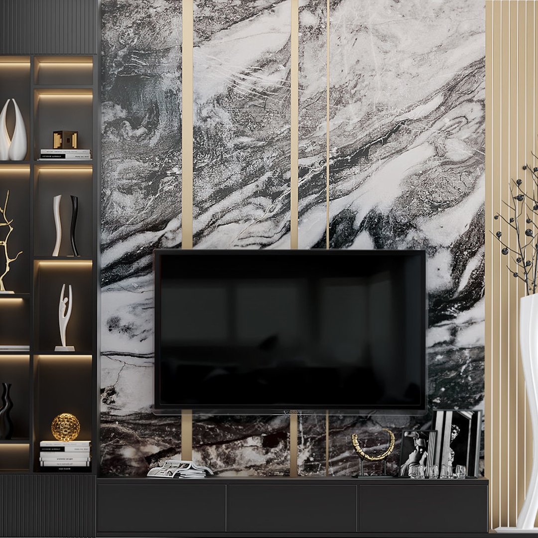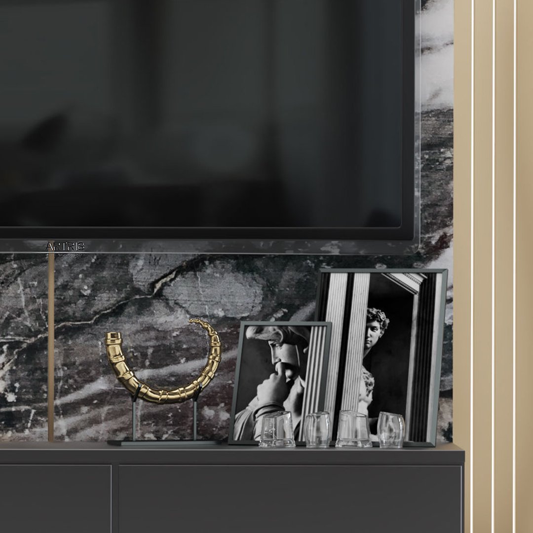 Güçlü çizgileri, göz alıcı mermer yüzeyi ve altın detaylarıyla öne çıkan bu TV ünitesi, yaşam alanlarına sofistike bir şıklık katıyor. Siyah-beyaz mermer damarlarının doğal dokusu, altın şeritlerle birleşerek modern sanatın zarif bir yansımasını sunuyor. Hem estetik hem de fonksiyonel yapısıyla, salon ve oturma odalarında dikkat çekici bir merkez noktası oluşturuyor.