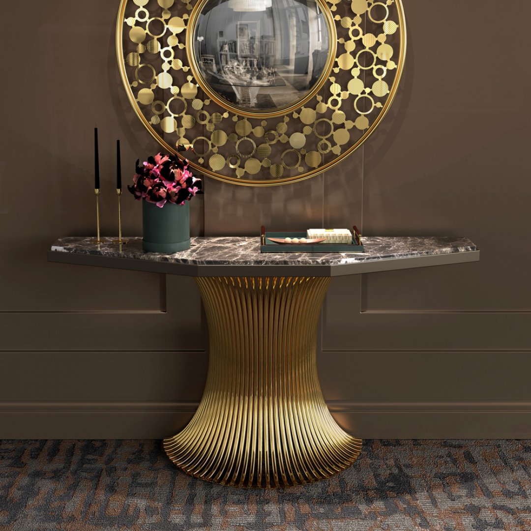 Zarif çizgileri, göz alıcı mermer yüzeyi ve ihtişamlı altın detaylı ayak tasarımıyla dikkat çeken bu mermer dresuar, yaşam alanlarınıza prestij ve lüks katıyor. Dalgalı formdaki altın renkli metal ayak yapısı, modern sanatın bir yorumu niteliğinde güçlü bir duruş sergilerken; doğal mermer üst tabla mekâna sofistike bir hava kazandırıyor. Estetiği fonksiyonellikle buluşturan bu dresuar, hem dekoratif bir obje hem de fonksiyonel bir mobilya olarak öne çıkıyor.