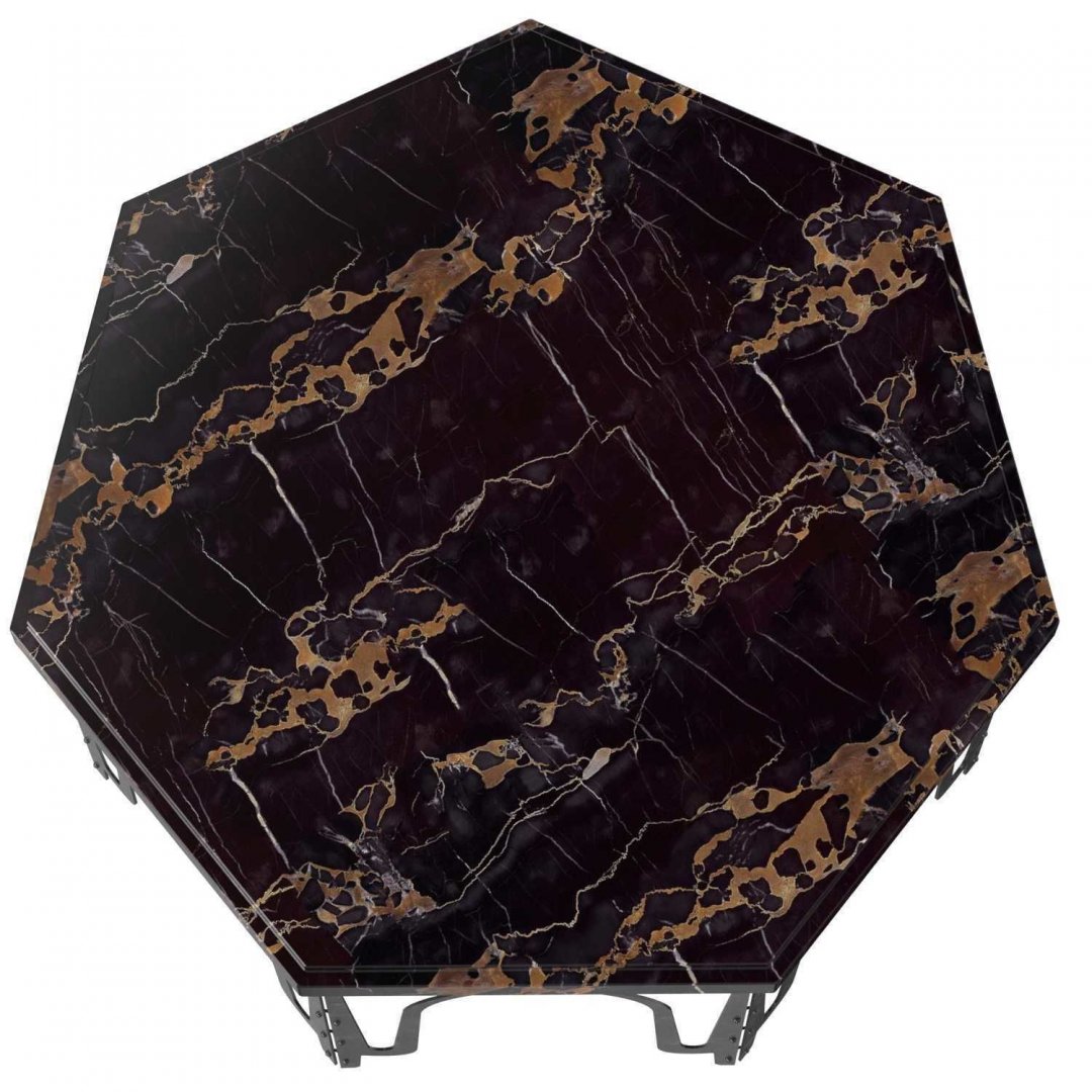 Zarif ve güçlü görünümüyle dikkat çeken bu granit sehpa, sekizgen formuyla mekâna farklı bir estetik kazandırıyor. Siyah zemin üzerinde yer alan kahverengi ve altın tonlarındaki damar detayları, doğal taşın ihtişamını yansıtarak lüks bir hava sunuyor. Geometrik metal ayak tasarımıyla desteklenen sehpa, hem görsel hem de yapısal açıdan modern iç mekânların vazgeçilmez parçası olmaya aday.