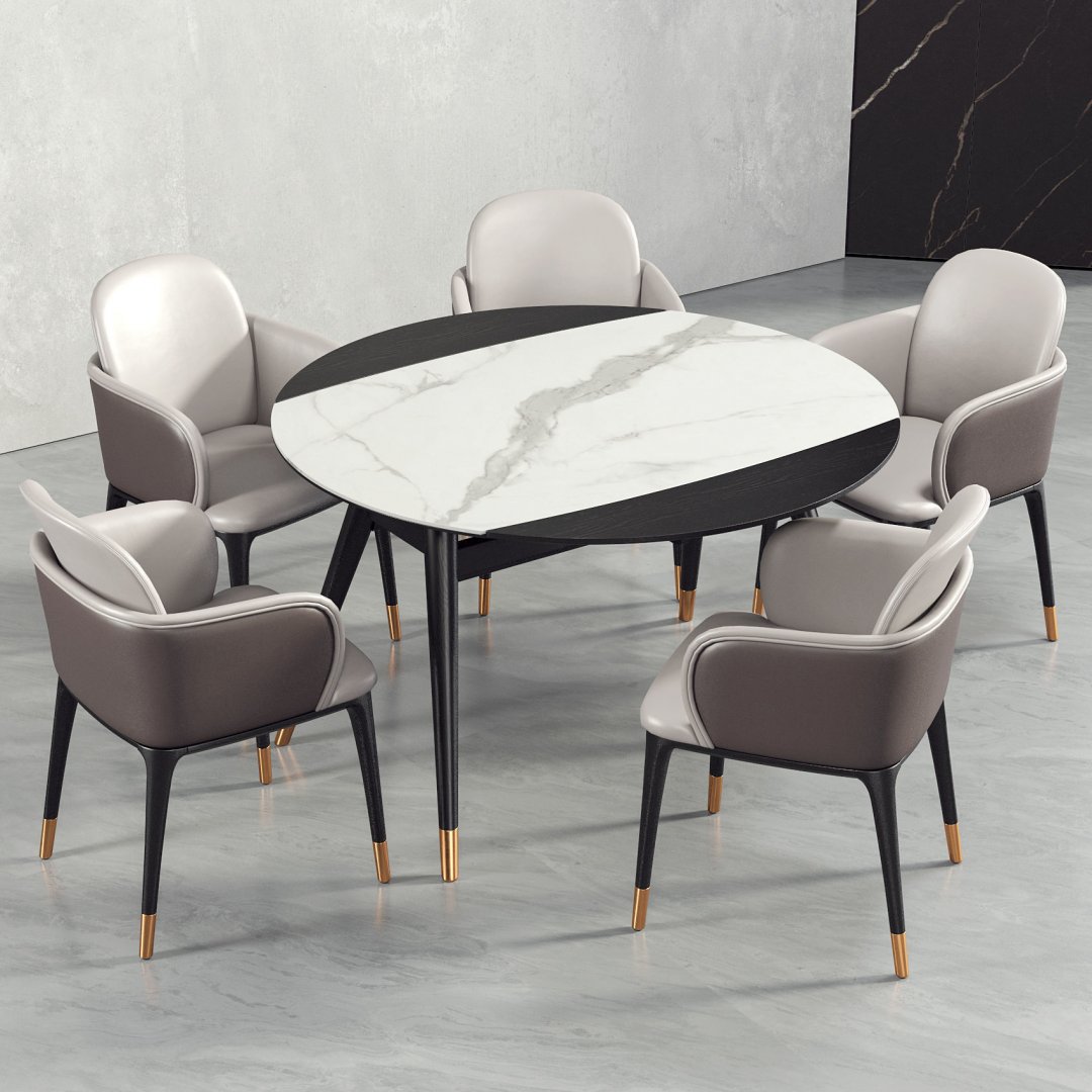 Modern çizgileri, zarif yuvarlak formu ve beyaz damar detaylı yüzeyiyle öne çıkan bu masa, sofistike bir estetik sunuyor. İnce siyah metal ayakları altın uç detaylarıyla tamamlanarak masaya şıklık ve zarafet katıyor. Açık granit tabla, ferah bir atmosfer oluştururken aynı zamanda mekâna lüks bir dokunuş ekliyor.