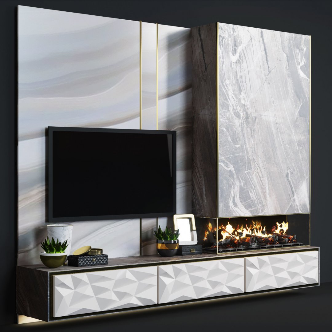 Tasarım: Entegre şömine ve TV ünitesi, geometrik desenli alt dolaplar