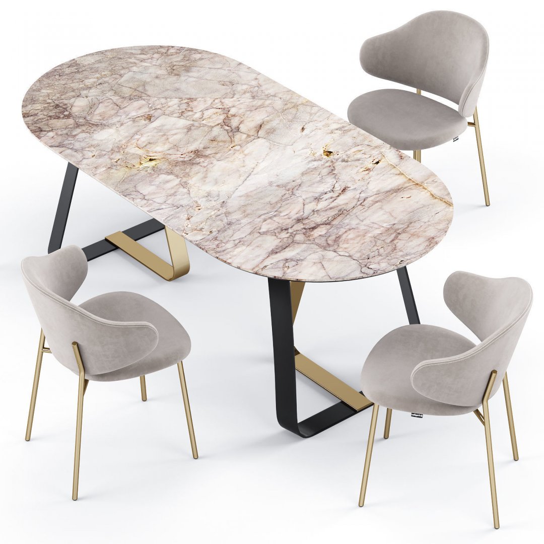 Zarif oval formu ve doğal granit yüzeyiyle dikkat çeken bu masa, sofistike ve modern bir duruş sergiliyor. Açık renk mermer görünümlü yüzeyinde yer alan altın ve kahve tonlu damar detayları, mekâna sıcaklık ve lüks bir hava katıyor. Siyah ve altın detaylarla tasarlanmış geometrik ayak yapısı, hem estetik hem de sağlamlık sunarak uzun yıllar dayanıklılığını koruyor. Şık olduğu kadar işlevsel de olan bu masa, farklı dekorasyon stillerine kolayca uyum sağlıyor.