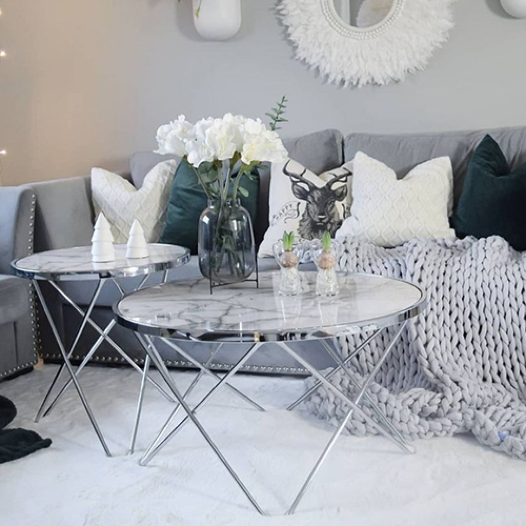 Şıklığı ve modern tasarımıyla dikkat çeken bu sehpa seti, beyaz mermer yuvarlak yüzeyi ve parlak krom çapraz ayak yapısıyla yaşam alanlarına zarif bir dokunuş katıyor. İnce damar detaylarına sahip mermer yüzey, ferah ve sofistike bir görünüm sunarken; geometrik metal ayaklar tasarıma modern bir denge kazandırıyor.