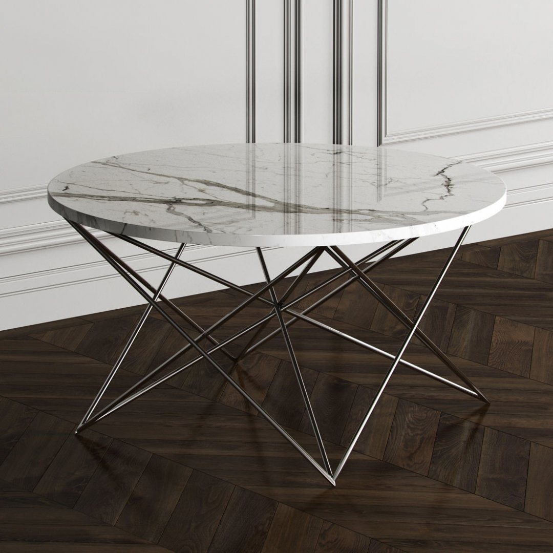 Zarif ve etkileyici tasarımıyla öne çıkan bu yuvarlak mermer sehpa, göz alıcı beyaz mermer tablası ve sanatsal bir heykeli andıran geometrik metal ayaklarıyla modern iç mekânlara farklı bir karakter katıyor. İnce çizgilere sahip çapraz ayak yapısı, sehpanın görsel hafifliğini artırırken aynı zamanda güçlü ve dengeli bir duruş sağlar.
