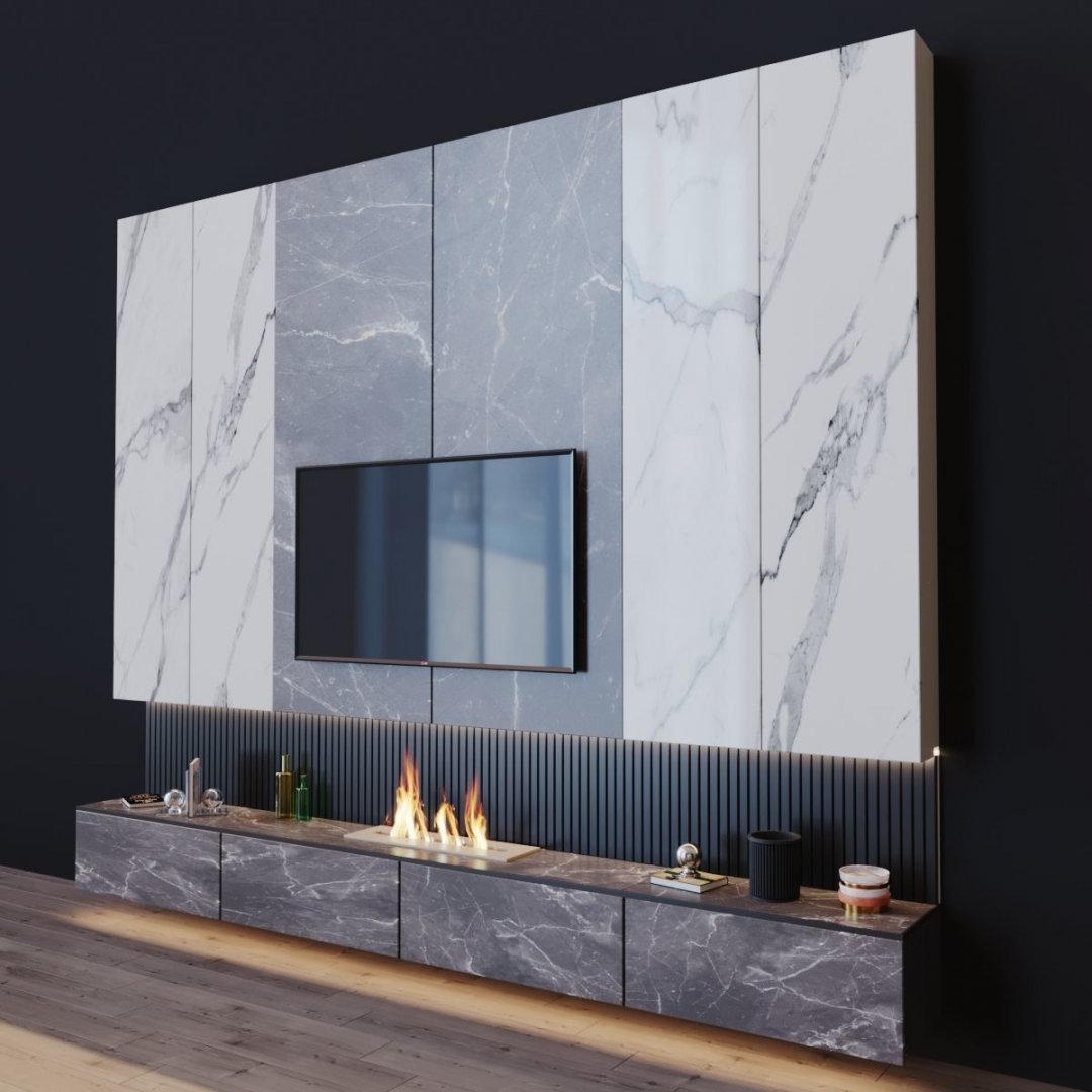 Modern çizgileri ve göz alıcı mermer yüzeyiyle dikkat çeken bu TV ünitesi, yaşam alanlarına sofistike bir atmosfer katıyor. Siyah-gri alt modülün güçlü duruşu, üst bölümdeki beyaz mermer panellerle dengelenerek ferah ve zarif bir görünüm oluşturuyor. Orta kısımda yer alan TV alanı, dekoratif çizgilerle çerçevelenmiş modern bir odak noktası sunarken; alttaki entegre şömine yaşam alanına sıcaklık ve lüks bir ambiyans katıyor.