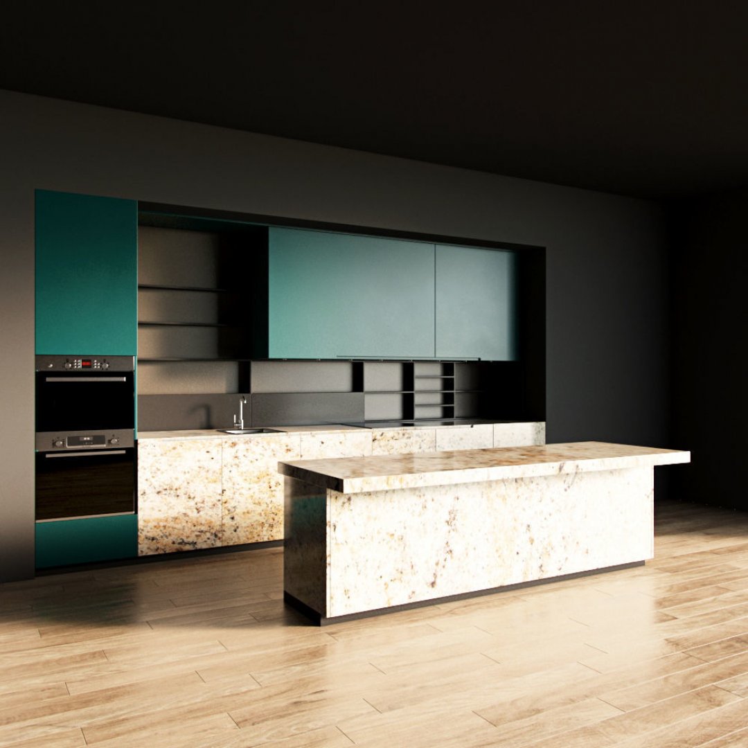 Doğal granitin zarafeti ve modern çizgilerin güçlü uyumuyla tasarlanan bu mutfak, estetikle işlevselliği buluşturuyor. Alt dolaplarda kullanılan mermer desenli granit yüzey, mekâna lüks bir karakter kazandırırken, turkuaz paneller ve bronz arka fon sıcak bir kontrast oluşturuyor.
