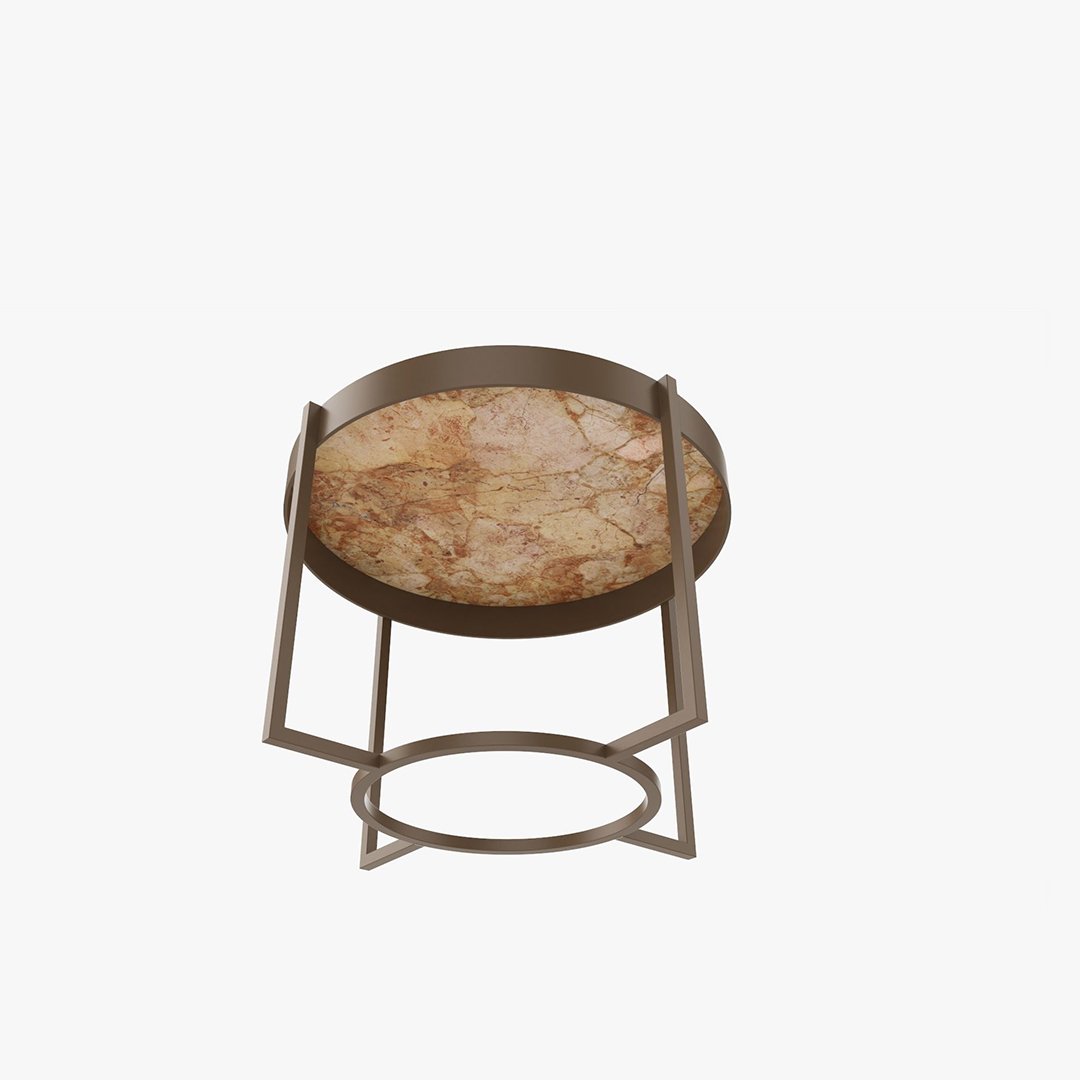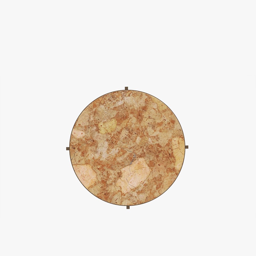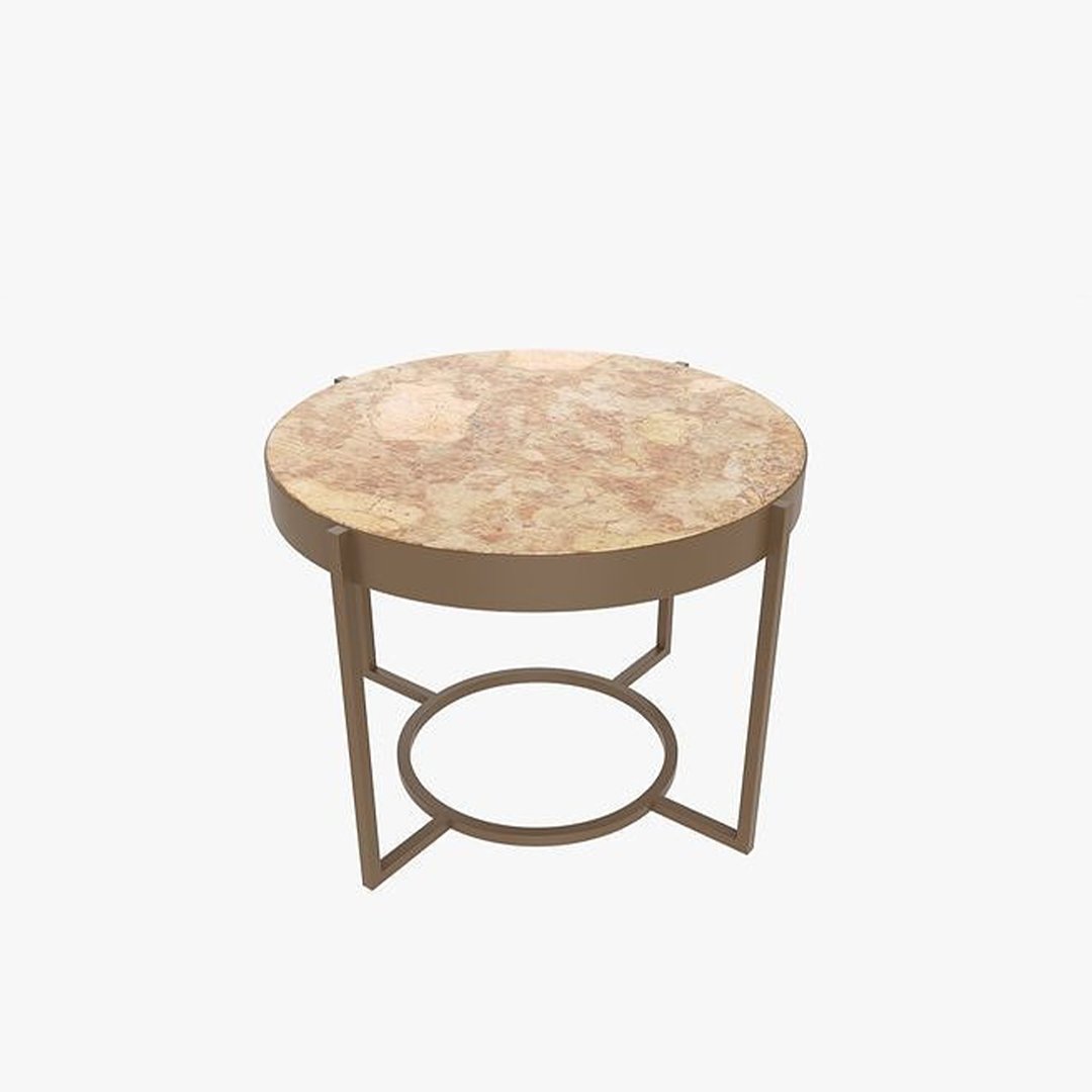 Sıcak tonları ve zarif tasarımıyla dikkat çeken bu yuvarlak sehpa, bej mermer yüzeyi ve altın bronz tonlu metal ayak yapısıyla yaşam alanlarına sofistike bir dokunuş katıyor. Mermer yüzeydeki doğal detayları mekâna sıcaklık ve estetik bir karakter kazandırırken, geometrik ayak tasarımı modern bir denge sunuyor.