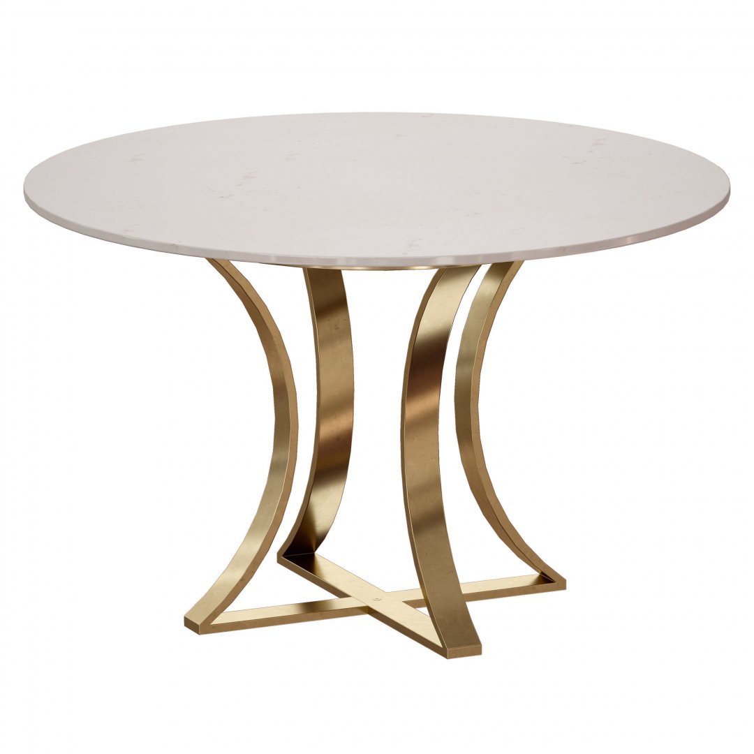 Zarafet ve lüksü bir araya getiren bu yuvarlak yemek masası, beyaz mermer üst tablası ve altın tonlu kavisli ayak tasarımıyla göz kamaştırıyor. Estetik kıvrımlara sahip metal ayak yapısı masaya hem sağlamlık hem de heykelsi bir duruş kazandırıyor.