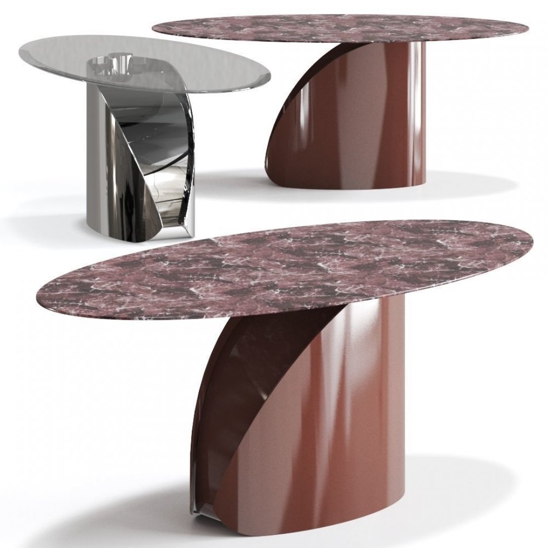 Sanatsal bir form ve modern çizgileri bir araya getiren bu yemek masası, heykelsi kıvrımlı ayak tasarımı ve zarif mermer yüzeyiyle dikkat çekiyor. Oval mermer üst tabla, doğal damar detaylarıyla sofistike bir görünüm sunarken; kıvrımlı ve güçlü gövde yapısı masaya modern bir karakter kazandırıyor.