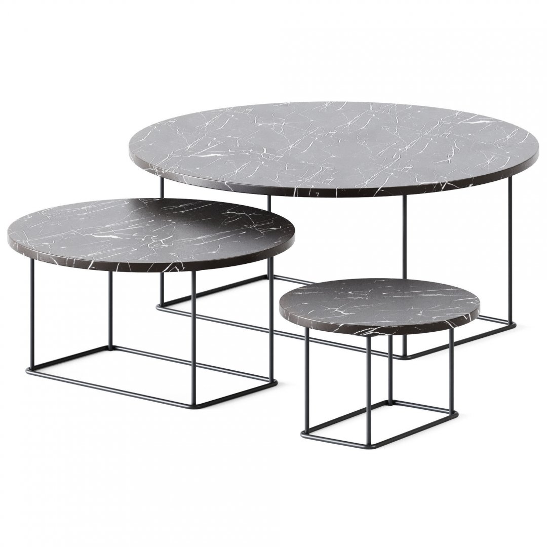 Tasarım: Yuvarlak form, üç farklı boy sehpa, ince ve geometrik metal ayak yapısı