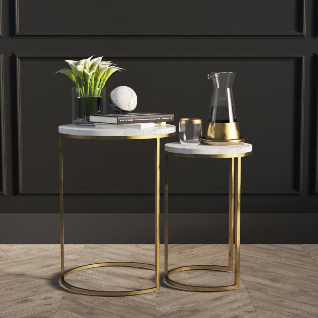 Zarif ve dayanıklı yapısıyla öne çıkan bu sehpa seti, dekoratif objelerinizden kitaplarınıza kadar birçok eşyayı şık bir şekilde sergilemenizi sağlar. Modern iç mekânlarda lüks bir tamamlayıcı olarak dikkat çeker.