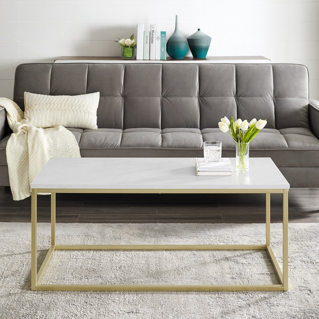 Modern ve zarif tasarımıyla öne çıkan bu orta sehpa, beyaz mermer yüzeyi ve altın tonlu ince metal ayaklarıyla yaşam alanlarına sofistike bir şıklık kazandırıyor. Beyaz mermer zemin üzerindeki gri damar detayları, tasarıma doğal bir zarafet katarken; geometrik ayak yapısı modern sanatın yalın estetiğini yansıtıyor.