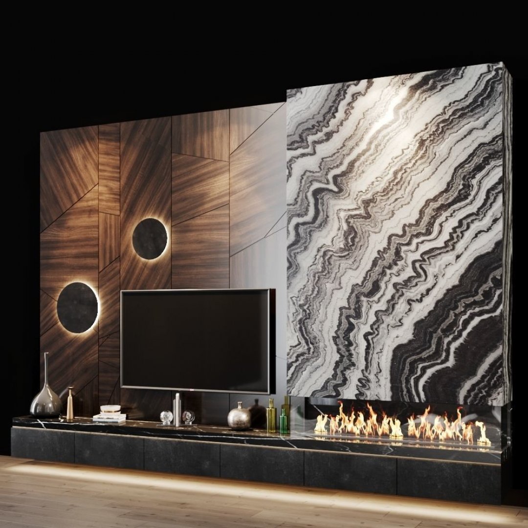 Tasarım: Dalgalı mermer panel, entegre şömine ve TV ünitesi, dekoratif LED aydınlatmalı ahşap yüzey