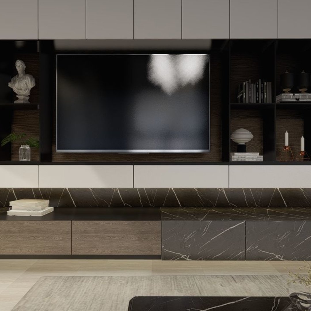 Modern çizgileri, göz alıcı mermer yüzeyi ve fonksiyonel tasarımıyla dikkat çeken bu TV ünitesi, yaşam alanlarına sofistike bir dokunuş kazandırıyor. Siyah mermer detayların ahşap yüzeylerle buluşması, mekâna hem sıcaklık hem de lüks bir hava katıyor. Geniş depolama alanları, düzenli bir kullanım sunarken şık tasarımıyla estetik bir bütünlük oluşturuyor.