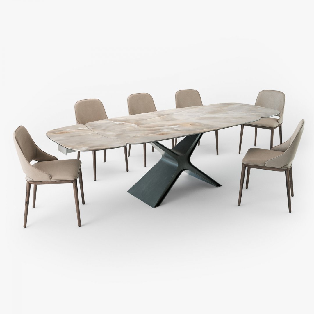 Bu yemek masası takımı, zarif oniks mermer yüzeyi ve heykelsi formdaki merkezi ayağı ile lüks ve modern tasarımın en şık örneklerinden biridir.