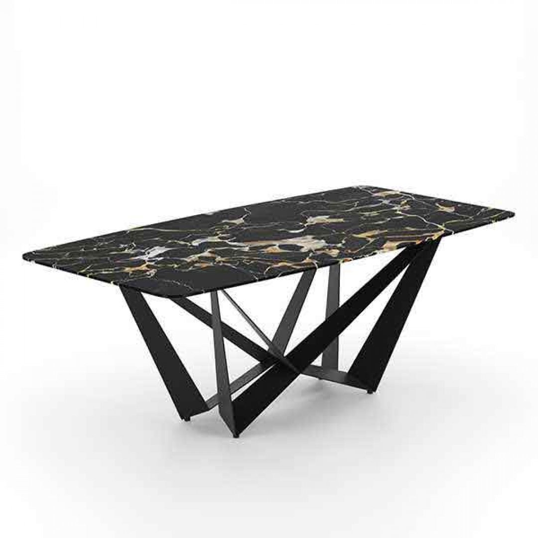 Güçlü çizgileri, göz alıcı yüzeyi ve dinamik ayak tasarımıyla dikkat çeken bu siyah mermer desenli dikdörtgen masa, güçlü ve etkileyici bir duruş sergiliyor. Geometrik metal ayak tasarımı, modern sanatın bir yansıması gibi dikkat çekerken; siyah zemin üzerindeki altın, beyaz ve gri damarlar masaya derinlik ve lüks bir hava katıyor.