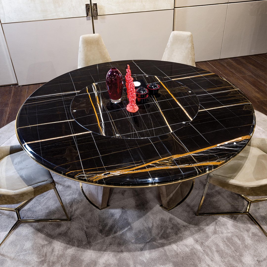 Portoro Gold mermer yemek masası, siyahın asaletini altın damarların göz alıcı ihtişamıyla buluşturan özel bir tasarım harikasıdır.