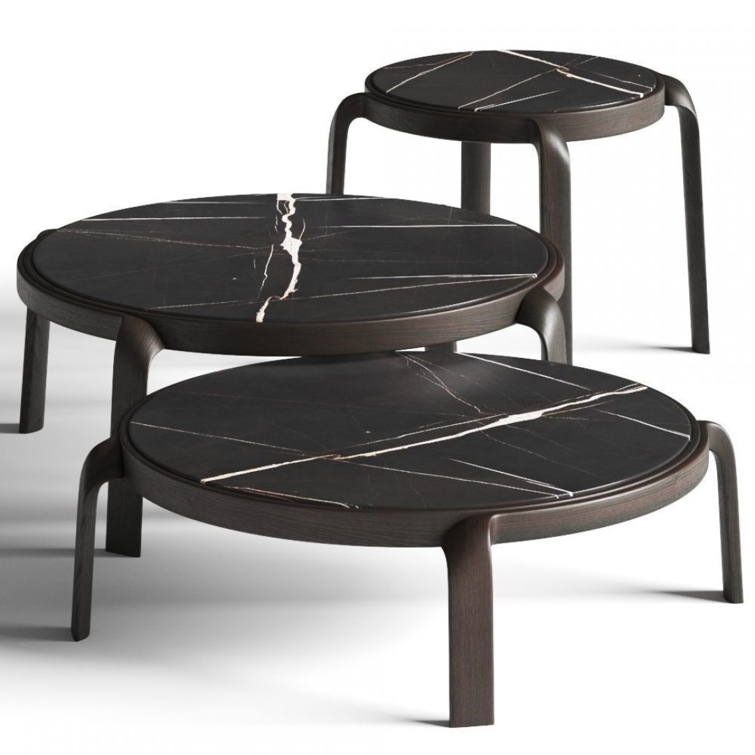 Tasarım: Yuvarlak form, farklı yüksekliklerde üçlü sehpa seti